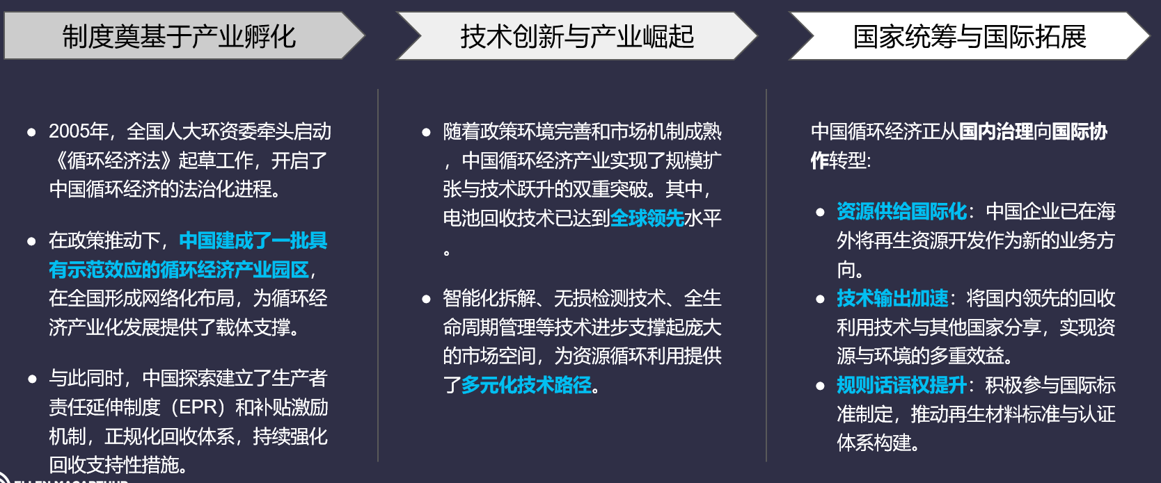 在由SMM主办的LBRI2025SMM锂电回收产业年会-回收企业家高层论坛上,艾伦·麦克阿瑟基金会(英国)北京代表处首席代表 关一松围绕“加速全球循环经济转型,提升动力电池价值链韧性”的话题展开分享。 循环经济影响力 EMF合作网络:每年节约约2.25亿吨原生材料使用; 到 2030年预计可节约18亿吨材料,相当于当今全球塑料、服装和消费电子产品总产量的3倍; EMF“新塑料经济“下全球承诺签署方每年可减少340万吨温室气体排放,相当于西雅图城市规模的年度排放量; 2023年参与EMF“牛仔再设计”项目的企业向市场推出了150多万条循环再造牛仔裤; 截至2024年9月循环经济相关项目已撬动4,000亿美元资金。 循环经济原则与基金会主要工作 我们认为,循环经济基于三项原则,皆由设计驱动: 消除废弃物和污染;循环产品和材料;促进自然再生。 基金会的主要工作: 循环经济理念发展及推广,联络和激发体系内核心参与与主动转型,推动全球大范围内的大规模系统性解决方案。 循环经济系统 循环经济蝴蝶图阐述了循环经济中材料的流动与循环的过程,其中包含两个最今本的循环方式:技术循环与生物循环。 在技术循环中,通过重复使用、维修、再制造与回收处理再利用,在经济活动中存续和利用产品、零部件和材料的最高价值,并防止其泄入自然。在生物循环中,通过堆肥和厌氧消化,食物和其他生物原料(例如棉花和木材)含有的养分都能安全地重归土壤,促进自然的再生。 循环经济助力应对气候变化 2024年,基金会与清华大学环境学院循环经济产业研究中心共同研究撰写《循环经济三重奏:助力中国落实气候行动》报告,旨在探索循环经济在应对气候危机中的关键作用和发展路径,协同推进中国循环经济转型与气候目标实现。 循环经济可以通过改变我们生产和使用产品的方式,补全减碳蓝图。 能源转型可减少全球55%的温室气体排放,剩下45%来源于日常生活物品的生产和消费。 循环经济助力减少温室气体排放,保障能源转型中供应链韧性,提升气候适应力 什么是循环经济三重奏? 助力降低难减排领域的温室气体排放 通过实施循环经济措施,预估年均可带来18亿吨的减排潜力,占总排放的三分之一以上。 保障能源转型中关键原材料供应,减少废弃物的产生 实施循环经济策略,可以有效减少对关键原材料的进口依赖,增强关键原材料的供应,推动可再生能源价值链向低碳和零废弃转型。 增强社会经济系统应对气候变化的韧性和适应能力 循环经济模式通过多渠道获取和循环利用资源,扩大了原材料供应的地理分布和来源多样性,从而增强了供应链的韧性,提高了社会经济系统适应气候变化的能力。 中国在过去二十年中构建了全球规模最大的循环经济体系,如今正迎来新一轮发展浪潮 循环经济已成为领先企业应对全球能源变局的有效途径 面对复杂多变的全球能源变局,循环经济正从辅助性手段升级为能源安全基石和产业竞争力核心。前瞻性企业已通过技术创新、模式重构和标准引领开辟三条破局路径。 从产品输出到技术赋能:领先企业正突破传统商品贸易局限,转向技术溢价与服务输出的高价值赛道。这包括了工艺包输出、装备高端化、服务化延伸三个关键跃迁。 规则与编制的国际引领:中国企业在循环经济标准体系建设上正从跟随者向引领者转变。中国龙头电池制造企业、回收企业、矿业企业等已深度参与甚至主导全球电池设计、生产、回收、梯次利用安全规范等领域的标准。 构建韧性供应链:地缘政治变局下,循环经济成为资源安全保障和产业链稳定的战略抓手。企业可通过城市矿山开发、“资源本地化+区域中心化”布局策略、数字化赋能等方式,构建有韧性的供应链网络。 基金会以能源转型和数字化转型为切入点,推动关键矿产循环经济 清洁能源转型加速和全球经济的电气化发展,正引发对关键矿产的巨大需求 在净零排放情景下,预计到2035年,许多关键矿产的需求将超过供应 各地关键矿产相关限制政策出台,对全球供应链韧性提出挑战 绿色技术壁垒:欧盟《电池法规》、CBAM、美国《通胀消减法案》等政策对关键矿产的回收率、碳排放核算、矿石产地等提出明确限制与要求。 出口管制与许可收紧:中国镓、锗、锑、中重稀土等 2024-2025 年连续列入出口管制,锂加工技术首次纳入许可证管理;缅甸、印尼等逐步禁止镍、钴等原矿出口。 信息透明与尽职调查:欧盟《冲突矿产条例》、美国SEC新规等均对关键矿产的尽职调查、回收比例等信息提出明确披露要求,强调矿产来源透明。 循环经济策略有助于填补供需缺口,打造安全、韧性的关键矿产供应链,推动全球完成绿色转型,应对气候变化 关键矿产循环经济机遇 把握机遇,提升供应链韧性 在全球地缘政治紧张、贸易壁垒加剧、关键矿产收获限制的背景下,各国正加速提升材料回收在构建安全、韧性供应链中的作用。 减少温室气体排放,提升气候适应力 通过实施循环经济措施,预估年均可带来18亿吨的减排潜力,占总排放的三分之一以上。 技术领先助力国际拓展 随着政策环境完善和市场机制成熟,中国循环经济产业实现了规模扩张与技术跃升的双重突破,并从国内治理向国际协作转型。 欧盟已形成体系化的动力电池循环利用法律法规要求,并设立明确的量化目标 》点击查看LBRI2025SMM锂电回收产业年会专题报