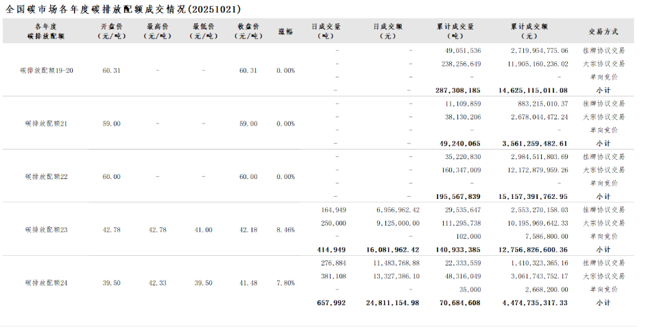 10月21日讯: 今日全国碳市场综合价格行情为: 开盘价52.11元/吨,最高价52.88元/吨,最低价52.11元/吨,收盘价52.59元/吨,收盘价较前一日上涨2.43%。 今日挂牌协议交易成交量441,833吨,成交额18,440,731.30元;大宗协议交易成交量631,108吨,成交额22,452,386.10元;今日无单向竞价。 今日全国碳排放配额总成交量1,072,941吨,总成交额40,893,117.40元。 2025年1月1日至10月21日,全国碳市场碳排放配额成交量113,465,418吨,成交额7,542,601,070.82元。 截至2025年10月21日,全国碳市场碳排放配额累计成交量743,734,082吨,累计成交额50,575,328,174.33元。 声明 全国碳排放权交易机构成立前,全国碳排放权交易信息由上海环境能源交易所股份有限公司(以下简称“交易机构”)进行发布和监督。 除生态环境部公开的全国碳排放权交易信息外,未经交易机构同意,其他任何机构和个人不得擅自发布全国碳市场综合价格行情及各年度碳排放配额成交情况等公开信息,如需转载需注明出处。擅自发布、转载未注明出处或转载非交易机构发布的全国碳排放权交易信息的机构或个人,交易机构有权依法追究其法律责任。 |