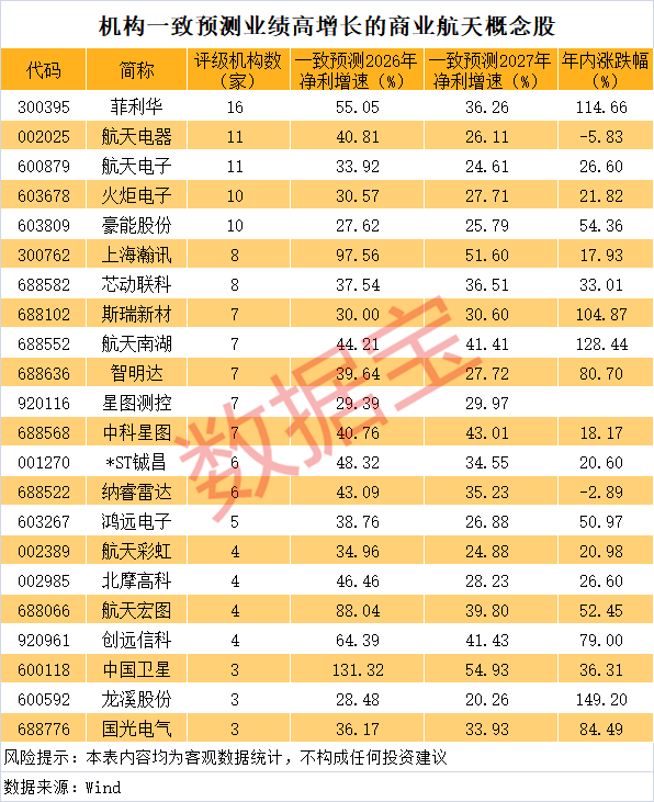 近年来,我国商业航天产业迎来前所未有的发展契机。 今天(10月21日)A股主要指数全线上涨,上证指数重回3900点大关,创业板指和科创50涨幅均超2.8%。全市场成交额近1.9万亿元,较上一交易日放量超1300亿元,上涨个股超4600只。涨幅在20%以上的个股多达11只,微创光电、中裕科技两只个股“30cm”涨停,正元地信、芳源股份等多只个股“20cm”涨停。 其中,云汉芯城(301563)也录得“20cm”涨停,该股是9月30日上市的次新股,今天涨停后股价创出收盘新高。值得一提的是,今天该股全天换手率接近54%,高居市场第二位。业内人士表示,云汉芯城之所有热度爆棚,主要是该股具有存储芯片、AI智能体、PCB、机器人和DeepSeek等多个热门科技概念。 近年来,我国商业航天产业迎来前所未有的发展契机,正从技术探索迈向规模化、市场化、资本化的新阶段。随着政策红利持续释放、核心技术不断突破,多家头部企业陆续启动IPO辅导,标志着商业航天正式进入资本市场的“聚光灯”下,产业整体迈入发展快车道。与此同时,资本市场热情高涨,相关概念股获机构密集关注,一场围绕“星辰大海”的投资浪潮正悄然兴起。 多家头部企业启动IPO辅导 2025年,商业航天企业IPO进程明显提速。继蓝箭航天宣布启动科创板IPO辅导后,屹信航天、中科宇航、微纳星空、国星宇航等都已启动了上市辅导。此外,星河动力、星际荣耀等民营航天企业也被传出正在筹备上市计划。 这一轮IPO热潮的背后,是科创板第五套上市标准的优化与落地。该标准允许尚未盈利但具备核心技术的“硬科技”企业上市,为前期投入大、回报周期长的商业航天企业打开了“绿色通道”。过去因盈利门槛受限而难以登陆A股的企业,如今有望通过资本市场获得长期资金支持,加速技术迭代与产能扩张。 IPO不仅是企业融资的手段,更是推动公司治理现代化、提升品牌影响力、实现员工股权激励与老股东退出的重要路径。随着多地出台专项扶持政策,商业航天正从“国家队主导”迈向“国企+民企”协同发展的新格局。 产业换挡提速 产业链近期利好消息频出。10月16日,我国在海南商业航天发射场使用长征八号甲运载火箭,成功将卫星互联网低轨 12 组卫星发射升空。10月17日,我国在太原卫星发射中心使用长征六号甲运载火箭,成功将千帆星座第六批组网卫星以“一箭18星”方式发射升空,发射任务由长征六号甲运载火箭执行,卫星由上海微小卫星工程中心抓总研制。 此外据报道,千帆星座运营公司上海垣信目前已开启新一轮50亿元至60亿元规模融资,投前估值超400亿元。千帆星座现已实现108颗组网星发射,计划于2026年年底实现648颗目标。 信达证券表示,政策+产业催化,商业航天产业换挡提速。该机构认为,以朱雀三号为代表的液体可回收火箭已经进入测试阶段,蓝箭航天等企业IPO推进+海南发射场建设有望加速商业航天落地。 这些概念股获机构密集关注 据证券时报·数据宝统计,A股中商业航天概念股有60余只。从机构关注度来看,菲利华、中航西飞、航天电器、航天电子等个股机构关注度较高,均有10家及以上机构评级;上海瀚讯、芯动联科、宗申动力等个股均有5家以上机构评级。 部分个股研报标题中提及了商业航天。比如东方证券表示,未来低轨卫星发射将成为常态化,航天电子作为航天电子产品核心配套企业有望充分受益;认为随着未来卫星招标节奏加快及火箭发射常态化,航天电子低轨卫星业务有望成为新的增长亮点。 另外,中科星图相关业务已经大幅增长。兴业证券研报显示,公司上半年低空经济营业收入0.64亿元,营收占比4.73%,毛利率50.34%;商业航天营业收入1.93亿元,同比增加137.51%,营收占比14.34%,同比增加6.97个百分点,毛利率60.4%,同比增加7.21个百分点。 从机构一致预测的角度来看,有3家及以上机构评级,且明后两年净利润增速均超20%的概念股有22只。其中,菲利华、上海瀚讯、芯动联科的机构一致预测净利增速均值较高,均超过30%。 声明:数据宝所有资讯内容不构成投资建议,股市有风险,投资需谨慎。 校对:王锦程 |