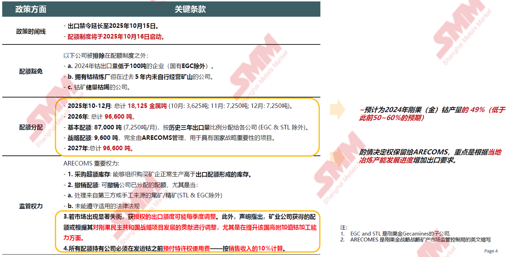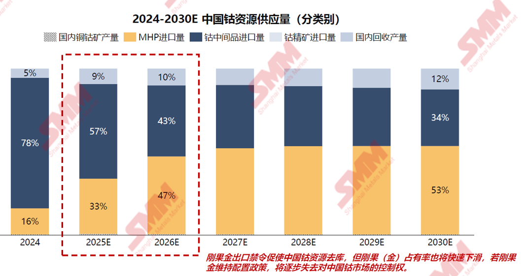 在由SMM主办的2025SMM锂电池原材料大会上,SMM 钴行业研究员 肖文豪围绕“钴市场供需格局与未来展望”的话题展开分享。他表示,根据全球钴供需平衡的预测来看,SMM预计,2024年到2030年,全球钴市场供应过剩的格局将延续,并且预计会持续很长时间,但需要注意的是,刚果(金)的出口限制可能导致地区市场失衡。 刚果金政策 刚果金出台明细配额细则,中国企业配额分配量偏低 刚果金出台明细配额细则,中国企业配额分配量偏低 ► 配额均分配给矿山企业及政府控制的平台(EGC、STL、ARECOMS),冶炼厂未获直接配额,配额不得转让、不得延期,当月未经使用配额将重新纳入战略配额。 ►中国企业掌握了约56%的基本配额出口额度,其中获得单笔最大配额的企业,是来自中国的洛阳钼业、共获得3.12万吨;其次北方矿业与中色集团分别获得4800吨和4440吨。 ► 全球矿业巨头嘉能可(Glencore)则获得了约1.33万吨,欧亚资源(EurasianResources)约1.02万吨。刚果(金)的三家政府平台(EGC、STL、ARECOMS)合计获得1.67万吨。 钴资源供应 2024-2030E年全球钴资源展望 提及全球原生与再生钴供应预测方面,SMM预计,2024年到2025年产量预计同比增长6%左右,2025年到2030年全球钴供应量复合年均增长率或将在6%左右。 分国家来看,SMM预计,到2025年,预计印尼原生钴的供应占比或将从2024年的12%提升至30%左右,刚果金原生钴供应占比有望从2024年的73%收窄至57%左右。 全球理论三元、钴酸锂电池以及可回收钴金属量 目前,可回收钴金属主要来自产间废料;2028年后,SMM预计报废电池中理论可回收金属量将逐步超过产间废料量。 SMM预计,2024年到2030年,来自社会退役的全球三元和钴酸锂电池的回收量复合年均增长率有望达到48%左右,全球理论可回收钴金属量复合年均增长率也或达44%左右,增长速度远超产间废料和库存退役。 2021-2030E年印度尼西亚MHP产能、产量 全球对MHP的需求强劲,开工率较高。印度尼西亚生产的MHP主要用于外销。 SMM预计,2021年到2030年,印度尼西亚MHP产能复合年均增长率有望在39.7%左右;产量的复合年均增长率或在66%左右,自2025年到2029年,印度尼西亚的MHP产量有望逐年攀升。 2024-2030E年中国钴资源展望 钴下游需求 三元与钴酸锂的钴需求变迁与展望 对于未来全球三元电池的产量预测,SMM预计,2024年到2030年,三元电池产量复合年均增长率或在-1%左右;相对应地,三元电池对钴金属的需求量复合年均增长率也或将呈现-3%的下滑。 全球钴酸锂产量方面,预计2024年到2030年,钴酸锂或将以9%的复合年均增长率上涨,对钴金属的需求量或将以8%左右的复合年均增长率上涨。 高端制造引领钴需求新纪元:聚焦低空技术与航空发展 据中国民航局预测,2035年低空经济市场规模有望达到3.5万亿元,2026-2035年复合增长率将达到14.14%。 飞机方面,当前,客机机队平均机龄床14.8年新高,IATA发出警告,随着对飞机需求的快速增长,当前交付进度无法满足2030年需求。 供需平衡与库存 全球过剩格局预计将持续很长时间,但刚果(金)的出口限制可能导致地区市场失衡 根据全球钴供需平衡的预测来看,SMM预计,2024年到2030年,全球钴市场供应过剩的格局将延续,并且预计会持续很长时间,但需要注意的是,刚果(金)的出口限制可能导致地区市场失衡。 情景模拟:刚果金中间品出口96600吨+ 80%出口中国 情景设定: 1. 出口禁令于2025年10月16日正式解除,10月出口3,625吨,11月和12月出口7,250吨,2026和2027年战略配额全部使用,每年总计出口96600吨; 2. 刚果金-中国运输周期:2~3个月; 3. 刚果金钴中间品有80%出口至中国; 在此情景模拟下,SMM预计2025年和2026年中国钴市场或将呈现供应紧缺的情况,直到2027年供应将重新转为过剩。 刚果金钴资源供需平衡方面,由于刚果金实行出口禁令,而钴属于铜金属伴生物正常开采,预计2025年往后刚果金钴库存将持续积累。 中国与刚果金外钴资源供需平衡方面,预计2025年除了中国和刚果金以外的钴市场,或将呈现供应偏紧的状态,到2026年或将转为供应小幅过剩。 从钴中间品市场来看,自6月起,钴中间品库存快速下降,预计这一趋势将持续;除金属钴外,其他钴产品库存均低于2个月,在成本上升背景下支撑价格传导;若金属钴与其他钴产品价差显著走阔,可能引发回炉重炼,加速其去库进程。 产业未来发展方向 三元市场持续被磷酸铁锂替代,且自身向高镍化发展 相较于三元电池,磷酸铁锂电池成本更低,因此,不少车企对磷酸铁锂电池的需求逐步提升,2024年磷酸铁锂电池在全球新能源汽车中的需求占比在58%左右,三元电池在42%左右;2025年,预计全球新能源汽车对磷酸铁锂电池的需求有望达到65%左右,三元电池的需求占比或将收窄至35%左右。 而未来,新能源汽车锂电需求板块,三元市场将持续被磷酸铁锂所替代,预计到2030年,磷酸铁锂电池占比将提升至72%左右,三元电池的需求占比或收窄至21%左右。 未来发展:中国企业面临钴资源紧张,稳定资源供应将是企业的生命线 展望未来,SMM预计中国企业或面临钴资源紧张的情况,因此,稳定资源供应将是企业的“生命线”,拓宽资源来源的方式有以下几点: 1. 从购买刚果金矿产到在当地进行深加工; 2. 在印尼获取矿权,或和矿企进行战略合作; 3. 布局回收市场,提高回收料占比; 4. 电钴反融。 》点击查看2025SMM锂电池原材料大会专题报道 |