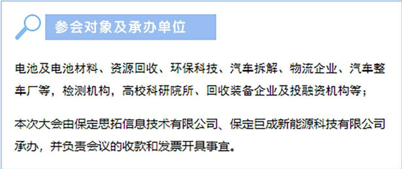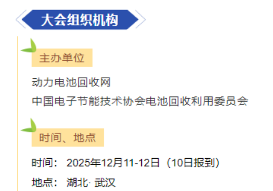 邀 请 函 动力电池回收利用产业经过十年的快速发展,规模化、合规化的企业数量快 速增长。动力电池回收与梯次利用联盟预计,2028 年中国废旧电池退役量超过 260 万吨,产值将达 2800 亿元。行业当下正处于未来十年长景气周期的起跑点, 电池回收利用产业将发展成一个新兴的绿色朝阳产业。 近年来,传统提锂技术因效率低下、稳定性不足、溶损严重而成为制约我国 锂资源自主保障的严峻挑战,产业急需高效、新型的绿色提取技术。动力电池回 收网、中国电子节能技术协会电池回收利用委员会、动力电池回收利用联盟将于 2025 年 12 月 11-12 日在武汉举办“2025 中国动力电池回收利用行业回收年会暨 新型、高效提锂技术发展论坛”,规模:500+,大会主题:绿色循环·高效提锂。 大会主要议题 废旧锂电池回收利用行业发展与市场解析 2026 电池材料市场供需分析与展望 废旧磷酸铁锂电池(LFP)高质回收利用技术发展 废旧三元锂电池高效资源再生技术与装备发展 废旧锂电池极片直接修复与再修复技术进展 退役动力电池梯次利用高效分选、重组技术; 新政下废旧锂电池、再生黑粉进口规范操作与通关验收 锂渣高值化综合利用与梯级分离技术进展 新技术、新人才与“电池循环利用工程师”职业技能培训 低能耗、高回收率提锂工艺技术(锂矿石、盐湖卤水、含锂废弃物等) 电动商用车(大巴、重卡、矿山)退役电池回收市场合作模式与电池换新机遇 退役动力电池回收利用行业高端闭门会议(特定邀请参加) 大会组委会联系方式 联系人:刘杰 电 话:18701681109(同微信) |
