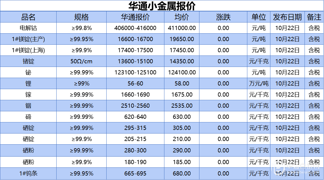 华通白银网 10月22日讯:电解钴、1#镁锭(生产)、1#镁锭(上海)、锗锭、铋、锂、镓、铟、碲、硒锭(99.99%)、硒锭(99.9%)、硒粉、硒粉(99.9%)、1#钨条报价