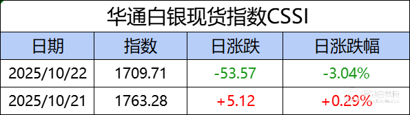 华通白银现货指数CSSI走势日报,今日指数1709.71,日涨跌-53.57,日涨跌幅-3.04%
