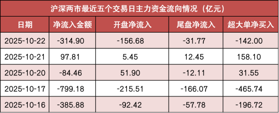 10月22日,大盘全天缩量震荡。 截至收盘,上证指数跌0.07%,深证成指跌0.62%,创业板指跌0.79%。A股全天成交1.69万亿元,上日成交1.89万亿元。 1.两市主力资金净流出超310亿元 今日沪深两市主力资金开盘净流出156.68亿元,尾盘净流出31.77亿元,全天净流出314.9亿元。