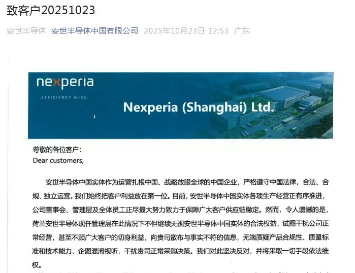 针对荷兰安世半导体警告客户无法保证来自其中国工厂的芯片质量的消息,10月23日,安世半导体中国有限公司官微发布双语版《致客户信》驳斥了上述言论,并表示公司所有在华生产并交付的产品均符合中国法律法规及相关监管部门的要求,完全满足安世一贯的技术标准、生产工艺及品质要求,符合与客户合同的各项约定。 目前,安世半导体中国实体各项生产经营正有序推进,公司董事会、管理层及全体员工正尽最大努力致力于保障广大客户供应链稳定。 坚决反对荷兰安世言论 这封落款为安世半导体(上海)有限公司的《致客户信》显示,目前,安世半导体中国实体各项生产经营正有序推进,公司董事会、管理层及全体员工正尽最大努力致力于保障广大客户供应链稳定。然而,令人遗憾的是,荷兰安世半导体现任管理层在此情况下不但继续无视安世半导体中国实体的合法权益,试图干扰公司正常经营,甚至不顾广大客户的切身利益,向客户散布与事实不符的信息,无端质疑产品合规性、质量标准和技术能力,企图混淆视听,干扰客户正常采购决策。公司对此坚决反对,并将采取一切手段依法维权。 尽管当前外部环境空前复杂,安世半导体中国实体始终将客户利益置于首位,将保障客户生产连续性视为公司现阶段最高追求。在此,公司郑重承诺:所有在华生产并交付的产品均符合中国法律法规及相关监管部门的要求,完全满足安世一贯的技术标准、生产工艺及品质要求,符合与客户合同的各项约定,并在出厂检验环节通过公司的严格质量检验。后续关于产品供应、生产工艺、技术标准等如有变更或调整,公司将会按照正常流程与客户提前沟通。 最后,安世半导体中国表示,只有与客户并肩应对、共渡难关,才能将不确定因素降至最低。 因此,安世半导体中国实体期待与客户继续保持紧密、透明的沟通,请客户一如既往地给予信任与支持,携手维护供应链的长期稳定与韧性,共同迎接未来的挑战与机遇。 据10月22日荷兰媒体报道,荷兰安世半导体已经向其客户发出警告,称无法再保证来自其中国工厂的芯片质量。 两国高层已交换意见 就安世半导体问题中荷两国高层已经交换意见。 10月21日,商务部部长王文涛应约与荷兰经济大臣卡雷曼斯通话时表示,中方高度重视中荷经贸合作。荷方针对安世半导体采取的有关措施,严重影响全球产供链稳定。中方敦促荷方从维护全球产供链安全稳定的大局出发,秉持契约精神和市场化、法治化原则,尽快妥善解决问题,保护中国投资者合法权益,营造公平、透明、可预期的营商环境。 卡雷曼斯表示,荷方高度重视荷中经贸关系,愿与中方密切沟通,为安世半导体问题寻找建设性的解决方案。 二级市场上,10月21日午后,闻泰科技涨停,10月22日股价回调;10月23日,该消息发布后,公司股价由跌转涨。 据《每日经济新闻》报道,有安世东莞组装厂员工介绍,因为部分原材料短缺和员工配置问题,从本周起部分岗位工时调整,加班时间也会相应减少,但是该消息并未获安世官方确认。 另外,供应链发布警告。近期欧洲汽车制造商协会(ACEA)警告,尽管汽车行业已经从市场上其他厂商采购同类型的芯片,但特定零部件新供应商的认证和产能提升将耗时数月,而当前安世半导体芯片的库存普遍预计仅能维持几周。德国汽车工业协会也敦促各方解决难题,如果安世半导体芯片供应中断的问题无法在短期内得到解决,甚至可能导致生产停产。 上市公司回应影响 10月12日,闻泰科技公告子公司安世半导体被荷兰政府实施全球运营冻结的“失控”事件之后,产生了连锁反应。近期安世半导体代理市场活跃,公司产品缺货涨价消息不断。据证券时报记者从线下代理商了解,安世部分车规级产品出现缺货,部分产品甚至“有价无市”,另外有消息称一级分销商控货。 据安世半导体官方披露,中电港系安世分销商之一。对于近期事件影响,中电港日前回复互动易平台提问时表示,公司是安世分销商之一,相关产品线收入占公司整体收入的比例较小,影响有限。 另有代理安世半导体产品的上市公司向证券时报记者透露,公司原有的安世半导体订单可以正常出货,但未来新签订单担心存在落地问题;目前安世半导体事件对公司影响有限。 |