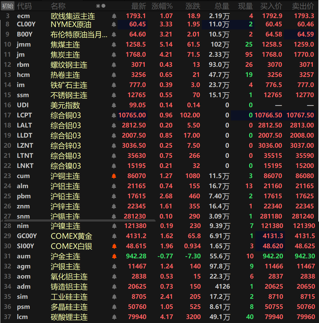 SMM 10月23日讯: 金属市场: 截至日间收盘,内盘基本金属集体上涨,沪铅以2.68%的涨幅领涨,沪铜、沪锌一同涨逾1%,沪铜涨1.27%,沪锌涨1.61%,其余金属涨幅均在1%以内。氧化铝主连涨0.53%,铸造铝主连涨0.73%。 此外,碳酸锂主连涨4.17%,多晶硅涨1.05%,工业硅涨2.41%,欧线集运主连涨1.07%报1793.1。 黑色系方面集体上涨,热卷涨0.65%,不锈钢涨0.55%。双焦方面,焦煤大涨5.14%,焦炭涨4.21%。 外盘方面,截至15:02分,外盘基本金属同样集体飘红,伦铜以0.96%的涨幅领涨,伦铅涨0.85%,伦锡涨0.75%,其余金属涨幅波动均不大。 贵金属方面,截至15:02分,COMEX黄金涨1.62%,COMEX白银涨1.96%。国内方面,沪金跌0.77%,沪银涨1.24%。 截至今日15:02分行情 》点击查看SMM行情看板 宏观面 国内方面: 【工信部柳新岩:系统布局全固态电池、金属空气电池等新一代电池研发工作】工业和信息化部装备工业发展中心党委书记、副主任柳新岩今日在2025新能源电池产业发展大会上表示,全球电池出货量前10的企业中,中国企业占据6席,占总出货量的比重达69%。工信部提出四点建议:一是强化技术创新引领,系统布局新型材料体系、全固态电池、金属空气电池等新一代电池研发工作,加速新技术的落地转化、产业化进程;二是提升产业链、供应链韧性,鼓励电池企业在锂资源回收和盐湖提锂技术等方面,进一步加大研发投入力度,不断拓展产品在工程机械、船舶、农机等领域的融合应用;三是优化产业发展环境,加大对新能源电池产业的支持和引导,完善政策法规、规范市场秩序,健全新能源电池标准体系,不断提高产品质量和安全性,为产业发展创造良好的环境;四是深化国际交流合作,鼓励产业链企业组团出海,支持企业积极开展技术创新、标准互认、碳足迹核算等方面的交流与合作。(财联社) 【9月份全社会用电量同比增长4.5%】国家能源局今天(10月23日)发布用电量数据显示,9月份,全社会用电量8886亿千瓦时,同比增长4.5%。从分产业用电看,第一产业用电量129亿千瓦时,同比增长7.3%;第二产业用电量5705亿千瓦时,同比增长5.7%;第三产业用电量1765亿千瓦时,同比增长6.3%;城乡居民生活用电量1287亿千瓦时,同比下降2.6%。1—9月,全社会用电量累计77675亿千瓦时,同比增长4.6%。 【前三季度国家铁路发送货物30.3亿吨 同比增长3.4%】记者从国铁集团获悉,今年前三季度,国家铁路累计发送货物30.3亿吨,同比增长3.4%。物流产品持续优化升级,助力降低全社会物流成本。前三季度,重点物资运输保障有力。煤炭、冶炼物资、粮食等运输项目开辟绿色通道,确保高效送达。1至9月,国家铁路发送煤炭15.53亿吨,其中电煤10.56亿吨,铁路直供电厂存煤保持较高水平。冶炼物资、粮食发送量同比分别增长9.4%、10.8%。 (央视新闻) 【央行公开市场今日净回笼235亿元】央行今日开展2125亿元7天逆回购操作,操作利率为1.40%,与此前持平。因今日有2360亿元7天期逆回购到期,当日实现净回笼235亿元。 ►10月23日银行间外汇市场人民币汇率中间价为1美元对人民币7.0918元 美元方面: 截至15:02分,美元指数上涨0.14%报99.05,据央视新闻客户端,当地时间10月22日,美国参议院未能通过共和党提出的临时拨款法案,政府“停摆”僵局仍在持续。这是近期在美国政府“停摆”之后,参议院第12次投票否决了该临时拨款法案。据白宫管理和预算办公室估计,美国历史上持续时间最长的政府“停摆”、即2018年长达35天的政府“停摆”,造成了110亿美元的经济损失。多项经济数据仍因美国政府停摆延迟发布,市场缺乏更多信息以研判美国经济表现。 美联储政策预期方面,CME FedWatch Tool显示,市场几乎 97%概率预期美联储10月降息25个基点,12月降息的概率约为 96%。另外,据市场调查显示,一项经济学家民意调查中,117位受访者中 115位预测美联储将在10月将利率下调至3.75%-4.00%,而全年降息次数方面,83位经济学家预期两次,32位预期一次。(文华综合) 宏观方面: 今日公布英国10月CBI零售销售差值、英国10月CBI工业订单差值、英国第四季度CBI企业乐观指数、美国截至10月18日当周初请失业金人数、美国截至10月18日当周续请失业金人数、加拿大8月零售销售月率、加拿大8月核心零售销售月率、欧元区10月消费者信心指数初值、美国9月成屋销售年化总数、美国9月非农就业人口变动季调后(10/23-10/25)等数据。值得注意的是:非农数据发布具体日期还没有确定,由于美国政府停摆还在持续,截至目前进行的十二次临时支出法案投票均未获通过,目前长期停摆的风险加大。 原油方面: 截至15:02分,两市油价一同拉涨逾3%,美油涨3.33%,布油涨3.21%。此前,美国对俄罗斯国家石油公司(Rosneft,俄油)和卢克石油公司(Lukoil)实施制裁,印度买家开始重新评估其对俄罗斯石油的采购。 Phillip Nova的高级市场分析师Priyanka Sachdeva说:“美国新一轮针对俄罗斯最大石油公司的制裁,旨在切断克里姆林宫的收入——此举可能会收紧俄罗斯原油的实际流通,并迫使买家将原油转向公开市场。”在美国宣布制裁后,布伦特和WTI原油期货每桶上涨了2美元以上,美国库存意外下降也提振了油价。Sachdeva补充说:“如果印度在美国的压力下减少购买量,我们可能会看到亚洲需求转向美国原油,从而提振大西洋油价。” 但市场对美国制裁是否会导致真正的根本性供需转变持怀疑态度,这限制了油价涨幅。 Rystad Energy的全球市场分析主管Claudio Galimberti表示:”