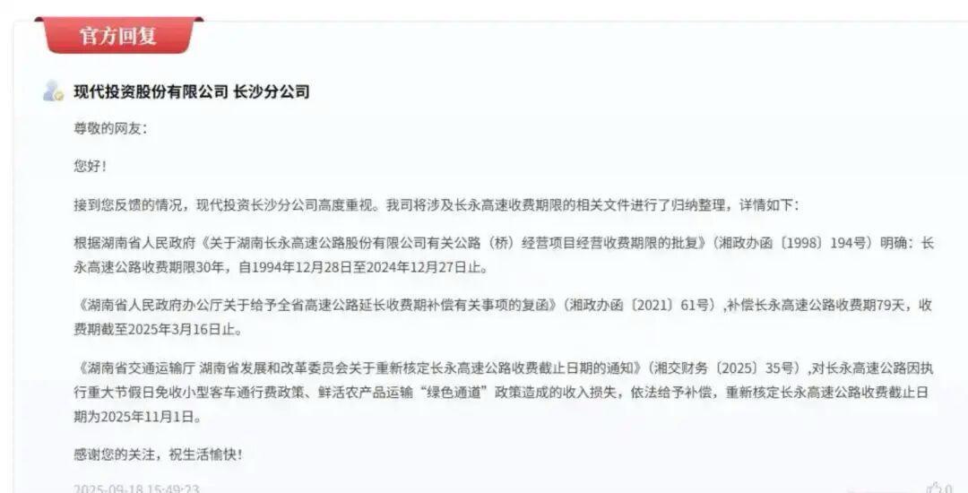面对一些市民的疑问,现代投资股份有限公司长沙分公司对“长永高速收费期限”的相关问题进行了官方回复。根据湖南省人民政府《关于湖南长永高速公路股份有限公司有关公路(桥)经营项目经营收费期限的批复》(湘政办函(1998)194号)明确:长永高速公路收费期限30年,自1994年12月28日至2024年12月27日止。 《湖南省人民政府办公厅关于给予全省高速公路延长收费期补偿有关事项的复函》(湘政办函(2021)61号),补偿长永高速公路收费期79天,收费期截至2025年3月16日止。《湖南省交通运输厅 湖南省发展和改革委员会关于重新核定长永高速公路收费截止日期的通知》(湘交财务(2025)35号),对长永高速公路因执行重大节假日免收小型客车通行费政策、鲜活农产品运输“绿色通道”政策造成的收入损失,依法给予补偿,重新核定长永高速公路收费截至日期为2025年11月1日。 这也就意味着11月1日开始,长永高速以后可以免费通行了,这也是目前国内停止收费的少数几条高速公路了。记者了解到,根据四川省交通厅官网消息,四川成绵高速公路、成都城北出口高速公路分别于2025年9月4日、9月17日收费到期。成绵高速公路、成都城北出口高速公路停止收费后,按照“零费率”方式运营,并代为收取其他路段车辆通行费。 那目前湖南省还有哪些高速公路运营接近30年呢?记者梳理了一下,根据资料记载的通车年份,在长永高速建成通车后,紧随其后,京珠高速长沙至湘潭段、长沙至益阳高速公路、湘潭至耒阳高速公路也相继开工建设。 长沙—湘潭高速公路,简称“长潭高速”,连接长沙市长沙县和湘潭市岳塘区,是G4京港澳高速的组成部分之一,1996年12月通车运营,截至目前为止已通车近29年;长沙-益阳高速公路,这是连接长沙与益阳的第一条高速公路,是G5513长张高速公路的重要组成部分,1998年7月通车运营,截至目前为止已通车27年;益阳—常德高速公路,简称“益常高速”,连接益阳市资阳区与常德市武陵区,是G5513长张高速公路的重要组成部分,1999年12月通车运营,截至目前为止已通车近26年;湘潭—耒阳高速公路,简称“潭耒高速”,连接湘潭市岳塘区和衡阳市耒阳市,是G4京港澳高速的组成部分之一, 2000年12月通车运营,截至目前为止已通车近25年。 |