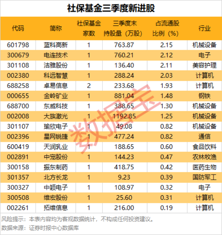 市场主要指数今日(10月24日)集体高开。科创50指数早盘一度涨超3%。 盘面上,存储芯片概念大幅上涨,普冉股份、航天智装“20cm”涨停,时空科技、翔港科技、大为股份等涨停,香农芯创、西测测试、江波龙等涨超10%。 商业航天概念掀涨停潮,航天环宇等“20cm”涨停,中国卫星、航天长峰、中天火箭等涨停。 深圳国企改革、煤炭、油气开采及服务等昨日强势板块早盘出现回调。 新股提示:N超颖开盘涨超3倍 N超颖今日上市,开盘价70.1元,开盘上涨310.42%。公司主营业务是印制电路板的研发、生产和销售,产品广泛应用于汽车电子、显示、储存、消费电子、通信等领域,公司以汽车电子PCB为主,是国内少数具备多阶HDI及任意层互连HDI汽车电子板量产能力的公司之一。 大明电子今日开启申购,公司此次发行总数为4000.1万股,其中网上发行960万股,申购代码732376,申购价格12.55元 ,发行市盈率为17.97倍。公司专注于汽车电子零部件配套领域,是一家专业从事汽车车身电子电器控制系统设计、开发、生产和销售的综合解决方案供应商。 中长线资金动向:社保基金新建仓17股,养老金新建仓15股 三季报密集披露,前十大流通股东数据透露出机构行踪。统计显示,社保基金共现身70只股,调仓动向方面,三季度社保基金新进17股、增持20股、减持20股,社保基金持股量保持不变的有13股。 社保基金新建仓股票中,从前十大流通股东名单中社保基金家数来看,社保基金家数最多的是卓易信息,共有2家社保基金出现在前十大流通股东名单中,即全国社保基金一一四组合、全国社保基金四一八组合,分别位列公司第四大、第六大流通股东,持股量合计为233.68万股,占流通股比例为1.93%。 从持股比例看,新进股中社保基金持有比例最多的是蓝科高新,持股量占流通股比例为2.15%;其次是电连技术,社保基金持股比例为2.12%;持股比例居前的还有洁雅股份、科远智慧、卓易信息等。 从持股量统计,社保基金新进的个股中,持股量最多的是大族激光,共持有1192.85万股;金岭矿业、蓝科高新等紧随其后,持股量分别为881.04万股、763.87万股。
