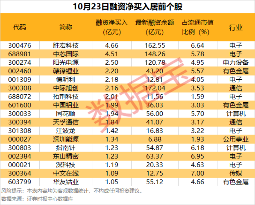 17股杠杆资金加仓超1亿元 截至10月23日,市场融资余额合计2.43万亿元,较前一交易日减少16.22亿元。 具体到个股,10月23日获融资净买入千万元以上的有384只,其中17只融资净买入额超1亿元。胜宏科技融资净买入额居首,当日净买入4.66亿元;其次是中芯国际、阳光电源,融资净买入金额分别为4.51亿元、2.50亿元;融资净买入金额居前的还有赣锋锂业、德明利、中际旭创等。 分行业统计,获融资客净买入超1亿元个股中,电子、有色金属等行业较为集中,分别有7只、3只个股上榜。