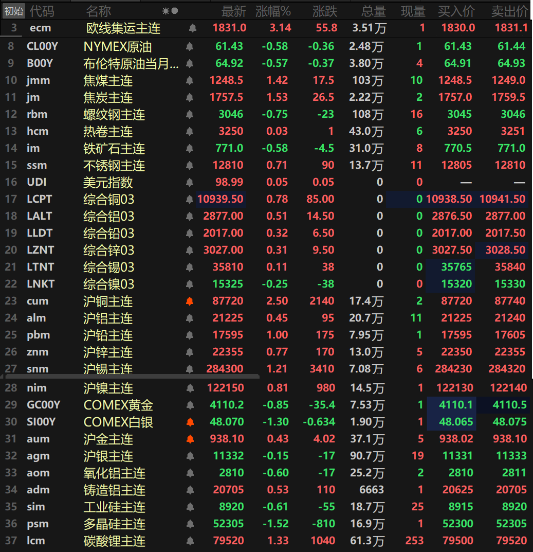 SMM 10月24日讯: 金属市场: 截至日间收盘,内盘基本金属集体飘红,沪铜以2.5%的涨幅领涨,录得五连阳;沪铅涨1%,沪锡涨1.21%,其余金属涨幅均在1%以内。氧化铝主连跌0.6%,铸造铝主连涨0.53%。 此外,碳酸锂主连涨1.33%,多晶硅主连跌1.52%,工业硅主连跌0.61%,欧线集运主连涨3.14%报1831。 黑色系方面涨跌互现,不锈钢涨0.71%,螺纹跌0.75%,铁矿跌0.58%。双焦方面,焦煤涨1.42%,焦炭涨1.53%。 外盘方面,截至15:05分,外盘基本金属中仅伦镍唯一下跌,跌幅达0.25%,其余金属均上涨,伦铜以0.78%的涨幅领涨,伦铝涨0.51%,其余金属涨幅波动均不大。 贵金属方面,截至15:05分,COMEX黄金跌0.85%,COMEX白银跌1.3%。国内方面,沪金涨0.43%,沪银跌0.15%。 截至今日15:05分行情