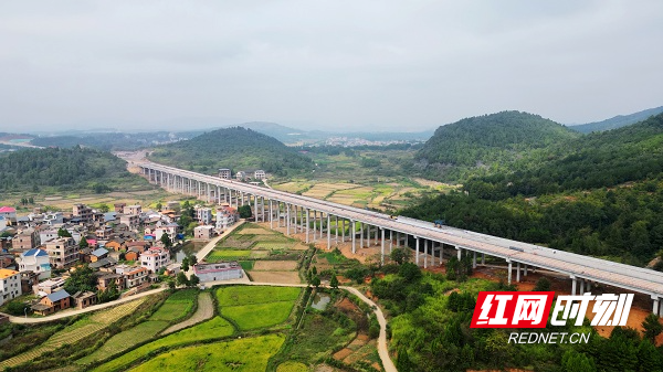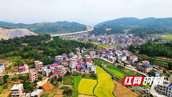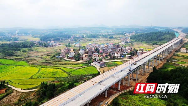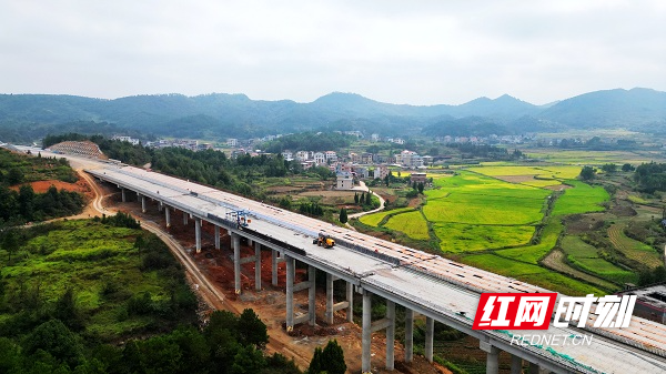 蜿蜒的桂新高速高架桥如灰色巨龙横穿而过,在建的桥体与金色稻田相映成趣——一边是自然馈赠的丰收画卷,一边是助力发展的希望通途。收割机在田垄间穿梭,桥墩上的工人正在施工,传统农耕与现代基建在这片土地上和谐共鸣。