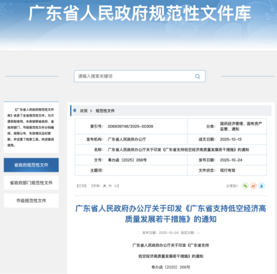 超级赛道迎来利好政策。 今日,广东省人民政府办公厅印发《广东省支持低空经济高质量发展若干措施》(以下简称《若干措施》)的通知,其中提出,推动省级低空空域管理改革,加快建设省综合飞行服务平台和广州、深圳、珠海等飞行服务站,提升空域协同运行管理与服务能力。加大对低空经济企业上市培育力度,支持符合条件的优质企业境内外上市。 近年来,低空经济相关政策逐步细化,行业日渐走向成熟,行业规模不断扩大。据中国民航局预测,2025年中国低空经济市场规模将达1.5万亿元,2035年有望突破3.5万亿元。有券商机构指出,国家战略聚焦低空经济新赛道,各地相继出台低空经济发展纲领性政策。从应用场景来看,低空物流、低空文旅等应用场景先行,其他领域亦在积极探索过程中。 广东最新发布 10月24日,广东省人民政府办公厅印发《广东省支持低空经济高质量发展若干措施》的通知,提出了16条具体举措,打造全国领先的低空经济产业发展高地。