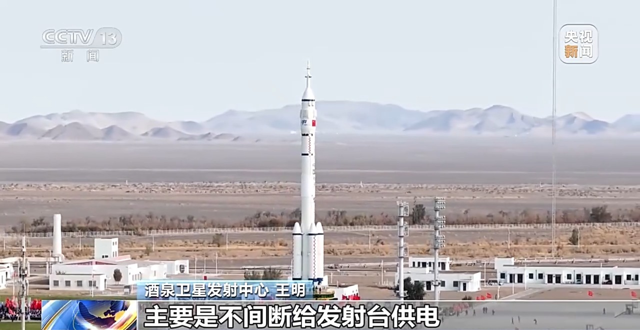 酒泉卫星发射中心 王明:推出来之后它静止,主要是供电车的一个掉头,刚开始推出来也看到了供电车是靠外端,停止之后供电车掉个头再掉到内端,主要是不间断地给发射台供电。