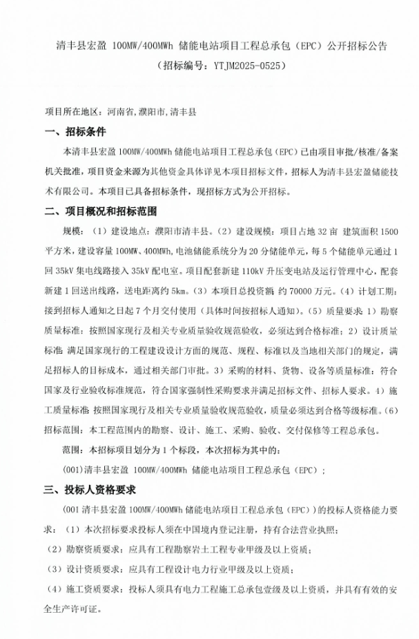 10月24日,清丰县宏盈储能技术有限公司发布清丰县宏盈100MW/400MWh储能电站项目工程总承包(EPC)公开招标公告。 项目位于河南省濮阳市清丰县,项目占地32亩,建筑面积1500平方米,建设容量100MW/400MWh,电池储能系统分为20个储能单元,每5个储能单元通过1回35kV集电线路接入35kV配电室。项目配套新建110kV升压变电站及运行管理中心,配套新建1回送出线路,送电距离约5km。 本项目总投资额约70000万元,折合单价1.75元/Wh。 招标范围为本工程范围内的勘察、设计、施工、采购、验收、交付保修等工程总承包。 投标人业绩要求:2022年1月1日至今,至少具有1个容量100MW/200MWh及以上的储能施工总承包或EPC总承包业绩。 本项目不接受联合体参加投标。 原文如下: