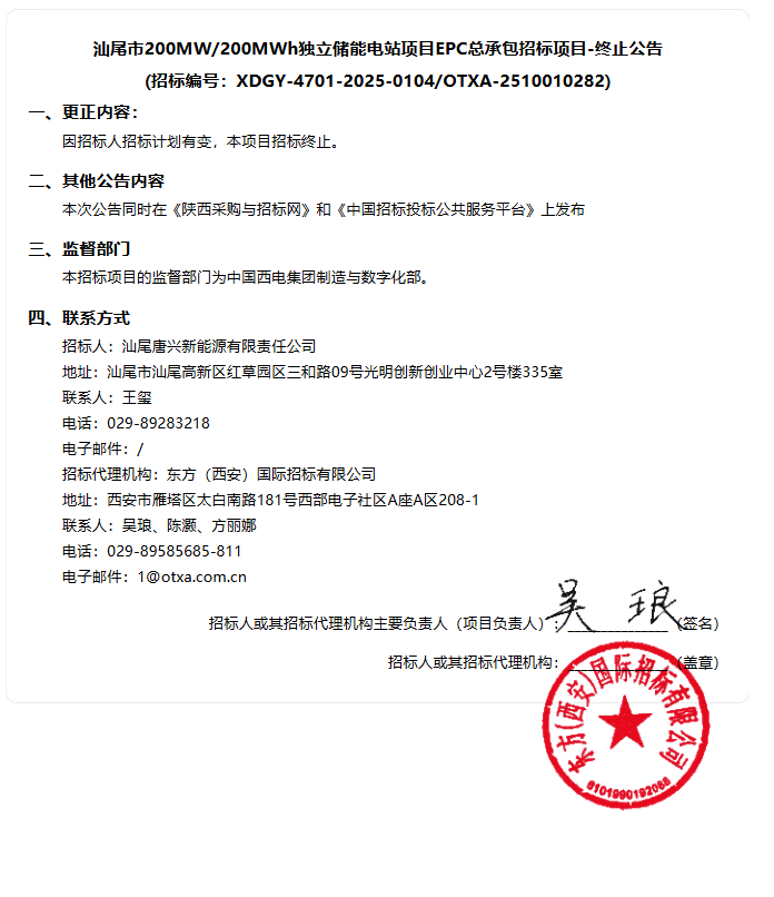 北极星储能网获悉,10月24日,广东汕尾市200MW/200MWh独立储能电站项目EPC总承包招标项目-终止公告发布。