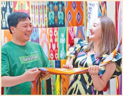 在新疆和田市吉亚丽人艾德莱斯绸店里,工作人员(右)向游客展示艾德莱斯绸。 和田市委宣传部供图