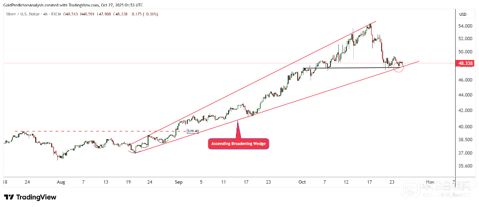 目前,价格正在调整,45美元是现货白银市场的有力支撑区域。 相对强弱指标表明,白银之前处于高度超买区域,这次修正对于稳定市场是必要的。 白银4小时图表-上升扩散楔形 现货银的4小时走势图也显示了一个上升扩散楔形模式的形成,类似于现货黄金市场的结构。 银价目前在48美元的支撑位附近,这与上升扩散楔形的下边界一致。 从这一水平反弹可能会在未来几天引发强劲的上行走势。然而,决定性的突破47.50美元可能会导致进一步下跌至45美元。