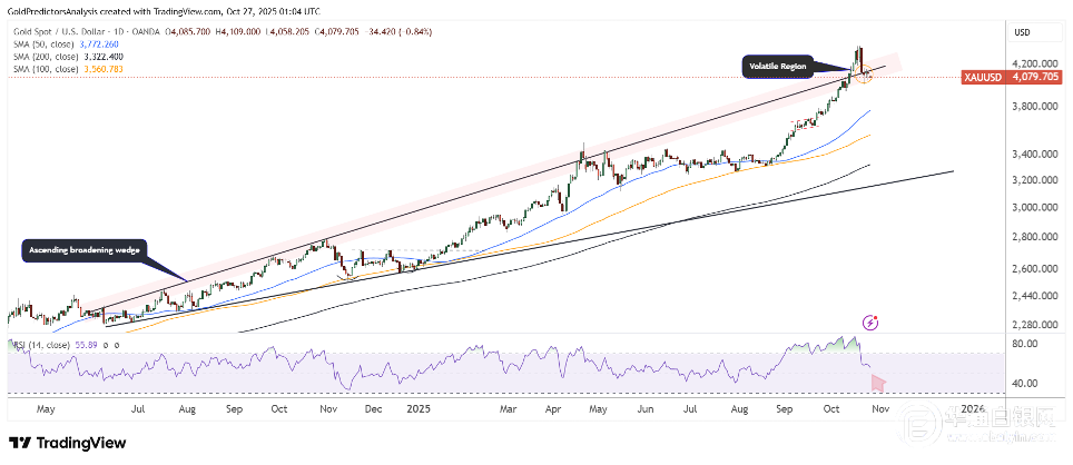 【华通白银网10月27日讯】•在美国通胀数据走软后,金价反弹,但在关键阻力位下方依然脆弱。 •银价正在从近期高点回调,目前强劲的支撑位支撑着看涨结构。 •美元指数继续盘整,盘整后可能恢复下跌压力。 在美国公布通胀数据略低于预期后,黄金减少跌幅。CPI走软强化了美联储周三降息的理由。提振了黄金市场的人气。 不过,现货黄金仍录得10周来首次单周下跌。这是由于获利了结和中美紧张局势的缓解,导致价格从4380美元的高点下跌。金价目前正在4000美元的关键水平上方盘整。跌破4,000美元可能引发金价进一步跌向3,850美元。然而,美联储的政策和风险情绪将引导下一步走势。 黄金技术分析 黄金日线图-上升扩散楔形 现货黄金的日线图显示,金价已突破上升的楔形扩大形态阻力位,达到创纪录的高点4380美元,之后,金价向上升扩散楔形的阻力线4000美元附近回撤。 在这次下跌之后,黄金价格目前正在波动范围内盘整,并为下一步走势做准备。值得注意的是,黄金仍远高于50日和200日均线,显示出强劲的看涨趋势。不过,如果金价回调至3,800-3,850美元区间,可能会给现货黄金带来强劲的买入机会。 从4380美元开始的修正主要由极度超买的情况所驱动,正如相对强弱指标所反映的那样。随着相对强弱指标稳定在中间水平以上,黄金市场的下一个方向可能会出现。