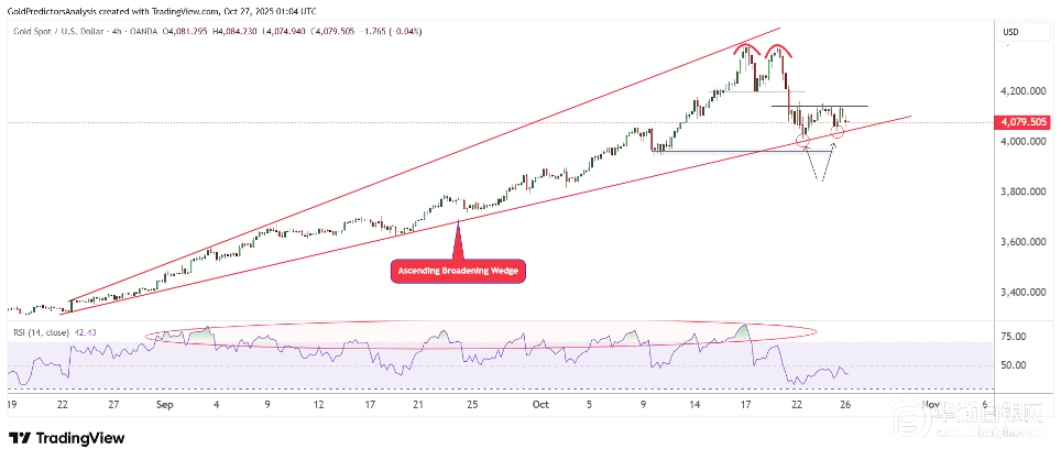 黄金4小时图表-上升扩散楔形 现货黄金的4小时走势图也显示出一个上升的楔形扩展模式,金价最近在4000美元处找到了强有力的支撑。 在触及该支撑区域后,金价似乎正在形成一个潜在的双底模式。如果金价确认突破4,250美元,则表明金价已经触底,暗示可能会延续上行趋势。 自2025年9月以来,黄金一直处于超买区域,因此从4380美元峰值的回调意义重大。随着金价回落至4000美元的水平,短期企稳已经出现,表明市场正在为下一步走势做准备。