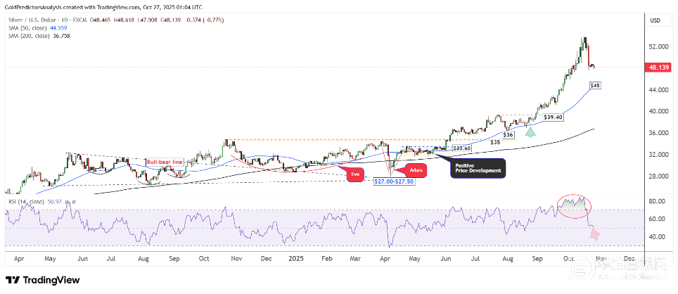然而,决定性地跌破4000美元将使看涨点失效,并可能为进一步回调至3850美元打开大门。 白银技术分析 白银日线图-看涨势头 现货白银日线图显示,自2024年以来一直表现出强烈的看涨行为。 突破35美元引发了强劲的反弹,将白银价格推至55美元附近的历史新高。