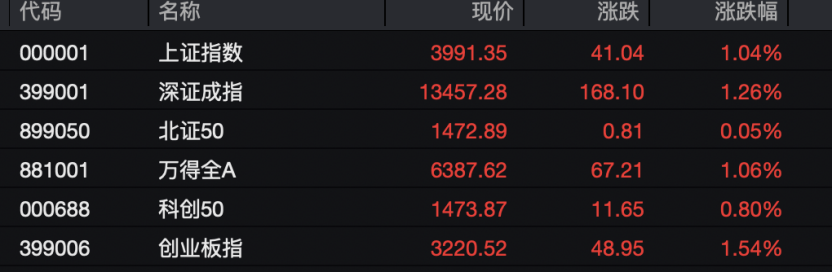 沪指逼近4000点。 今天(10月27日)上午,A股市场强劲上行,上证指数跳空高开,再创最近十年新高,盘中一度逼近4000点大关。 两融规模方面,A股市场两融余额再度出现增长。截至2025年10月24日,沪、深、北三市两融余额合计值达24571.9亿元,离历史新高仅有一步之遥,单日增长61.5亿元。 上证指数再创最近10年新高 盘中逼近4000点大关 今天(10月27日)上午,A股市场强劲上行,上证指数跳空高开。 数据显示,自2015年8月以来,上证指数仅两个交易日盘中一度站上4000点,分别为2015年8月14日及2015年8月18日。 今日上午,上证指数盘中突破3990点,离4000点整数关口仅一步之遥,再度刷新最近十年新高,上一次上证指数超过4000点为2015年8月18日,当天盘中上证指数最高点为4006.34点。 截至午间收盘,上证指数涨1.04%,报3991.35点;深证成指涨1.26%,报13457.28点;创业板指涨1.54%,报3220.52点;科创50指数涨0.8%;北证50指数涨0.05%。