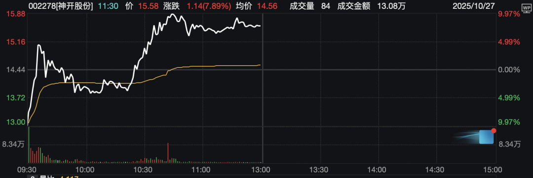 主要行业板块和赛道方面,呈现普涨态势。若按照申万一级行业划分,通信、综合、钢铁、公用事业、有色金属等板块涨幅居前。传媒、电力设备板块表现相对疲弱。 概念板块方面,光刻机、镍金属、可控核聚变、锂矿、风沙治理等板块涨幅居前。赛马概念、ST板块跌幅居前。 个股方面,被股民称为“易中天”的热门股继续上行,其中新易盛盘中涨超11%,突破前期高点,创出历史新高;中际旭创盘中也创出历史新高;天孚通信也强劲上行,盘中涨幅一度超过7%。 神开股份盘中上演“地天板” 大幅波动的个股方面,神开股份(002278)开盘跌停,盘中股价拉升,一度触及涨停,上演“地天板”,截至发稿,涨幅在7%以上,成交额超过20亿元。