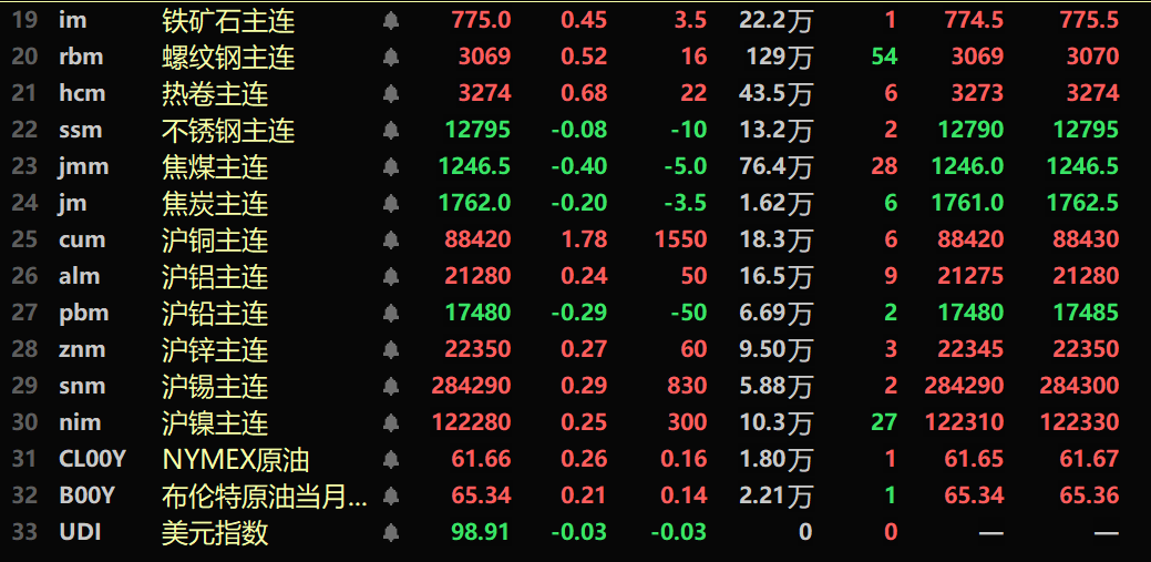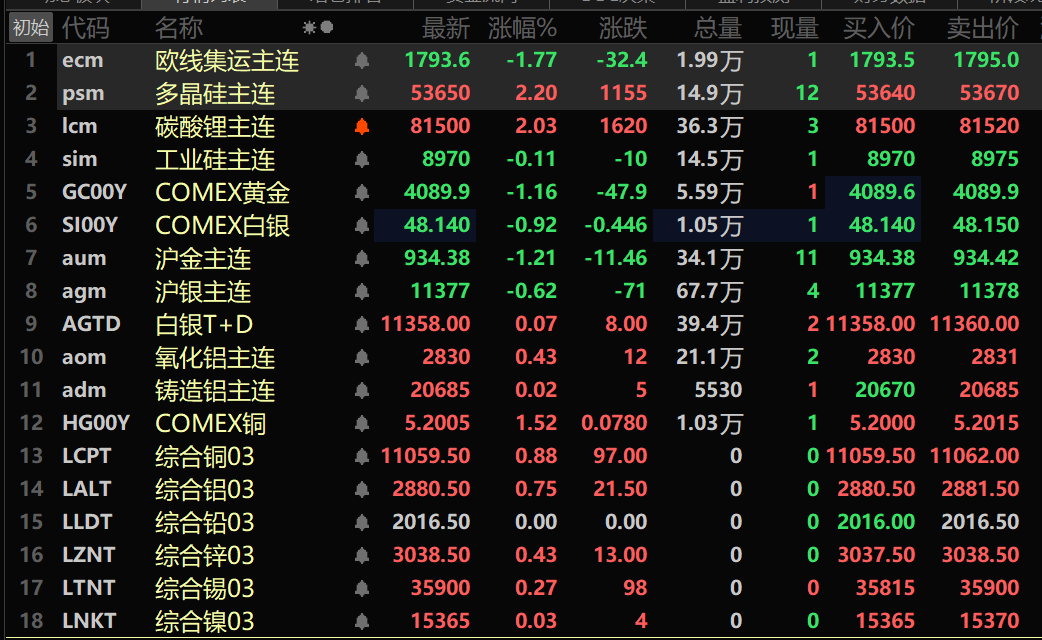 SMM10月27日讯: 金属市场方面: 截至午间收盘,内盘基本金属近全线上行,沪铜涨1.78%。沪铝涨0.24%,沪铅跌0.29%,沪锡涨0.29%,沪镍涨0.25%,沪锌涨0.27%。 此外,铸造铝主连期货微涨,氧化铝主连涨0.43%。碳酸锂主连涨2.03%,工业硅主连跌0.11%。多晶硅主连涨2.2%。 黑色系涨跌互现,铁矿涨0.45%,螺纹涨0.52%,热卷涨0.68%,不锈钢跌0.08%。双焦方面:焦煤主力合约跌0.4%,焦炭主力合约跌0.2%。 外盘金属方面,截至11:42分,LME金属近全线上涨,伦铜涨0.88%。伦铝涨0.75%,伦铅平于2016.5美元/吨,伦锡、伦镍分别涨0.27%、0.03%。伦锌涨0.43%。 贵金属方面,截至11:42分,COMEX黄金跌1.16%,COMEX白银跌0.92%。内盘贵金属方面:沪金主连跌1.21%,沪银主连跌0.62%。 截至午间收盘,欧线集运主力合约跌1.77%,报1793.6点。 截至10月27日11:42分,部分期货午间行情: