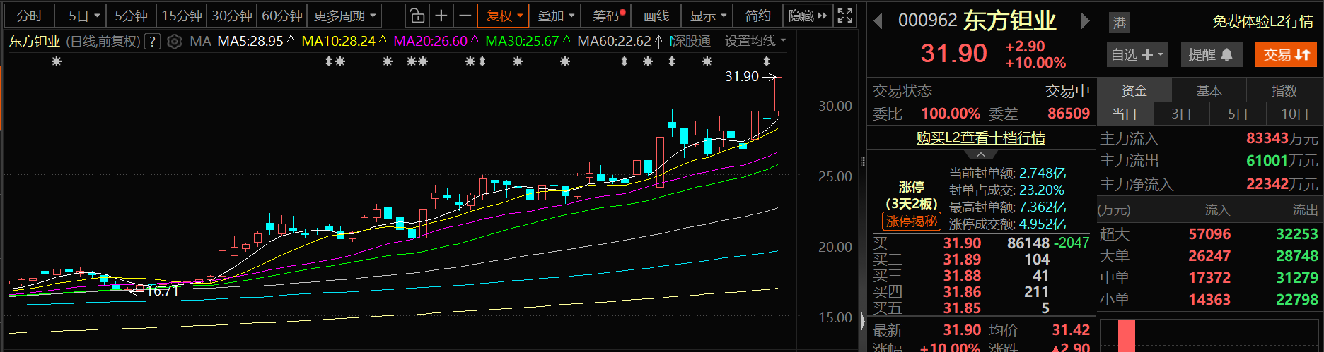 10月27日,东方钽业股价盘中再次出现涨停,这也是其继10月23日的涨停之后,再次出现了涨停,截至27日13:31分,东方钽业涨10%,报31.9元/股。