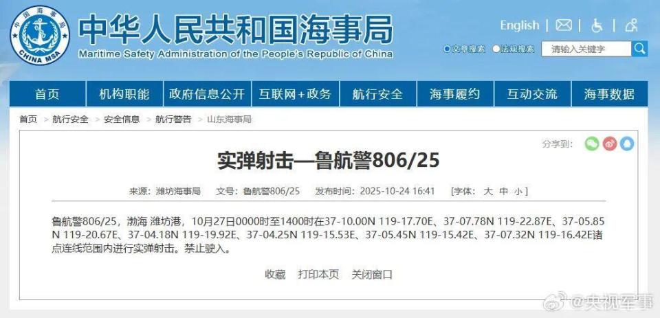 据中国海事局网站消息,潍坊海事局发布航行警告,10月27日0时至14时,渤海潍坊港部分海域进行实弹射击,禁止驶入。
