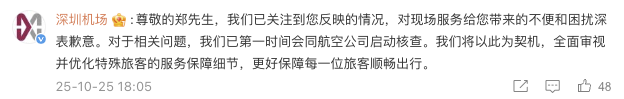 10月25日下午,郑智化在微博发文称,自己当日在深圳机场乘坐深航ZH9073航班前往台北时,升降车升至机门后离机门地板有25厘米距离,导致其轮椅无法推入飞机。他指责操纵升降车的司机不愿把升降板提高,致使自己只能“连滚带爬”进飞机,并怒斥这种行为“没人性”。该文一经发出,迅速引发网友热议。 当日18时左右,深圳机场在郑智化微博下回复,对现场服务给其带来的不便和困扰深表歉意,并表示已会同航空公司启动核查。