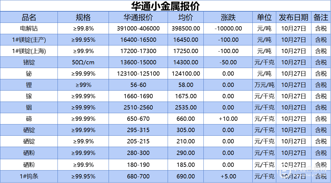 华通白银网 10月27日讯:电解钴、1#镁锭(生产)、1#镁锭(上海)、锗锭、铋、锂、镓、铟、碲、硒锭(99.99%)、硒锭(99.9%)、硒粉、硒粉(99.9%)、1#钨条报价