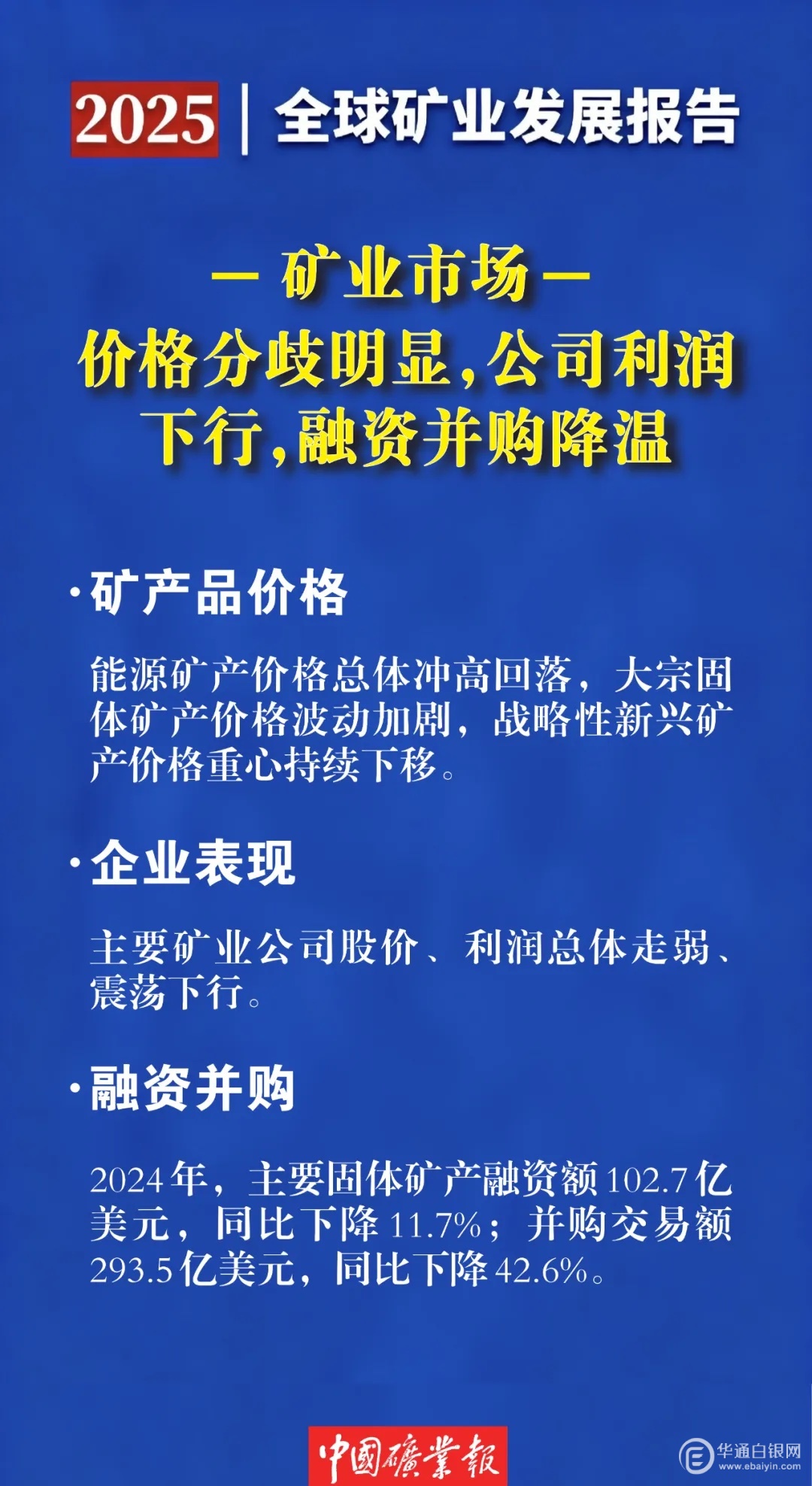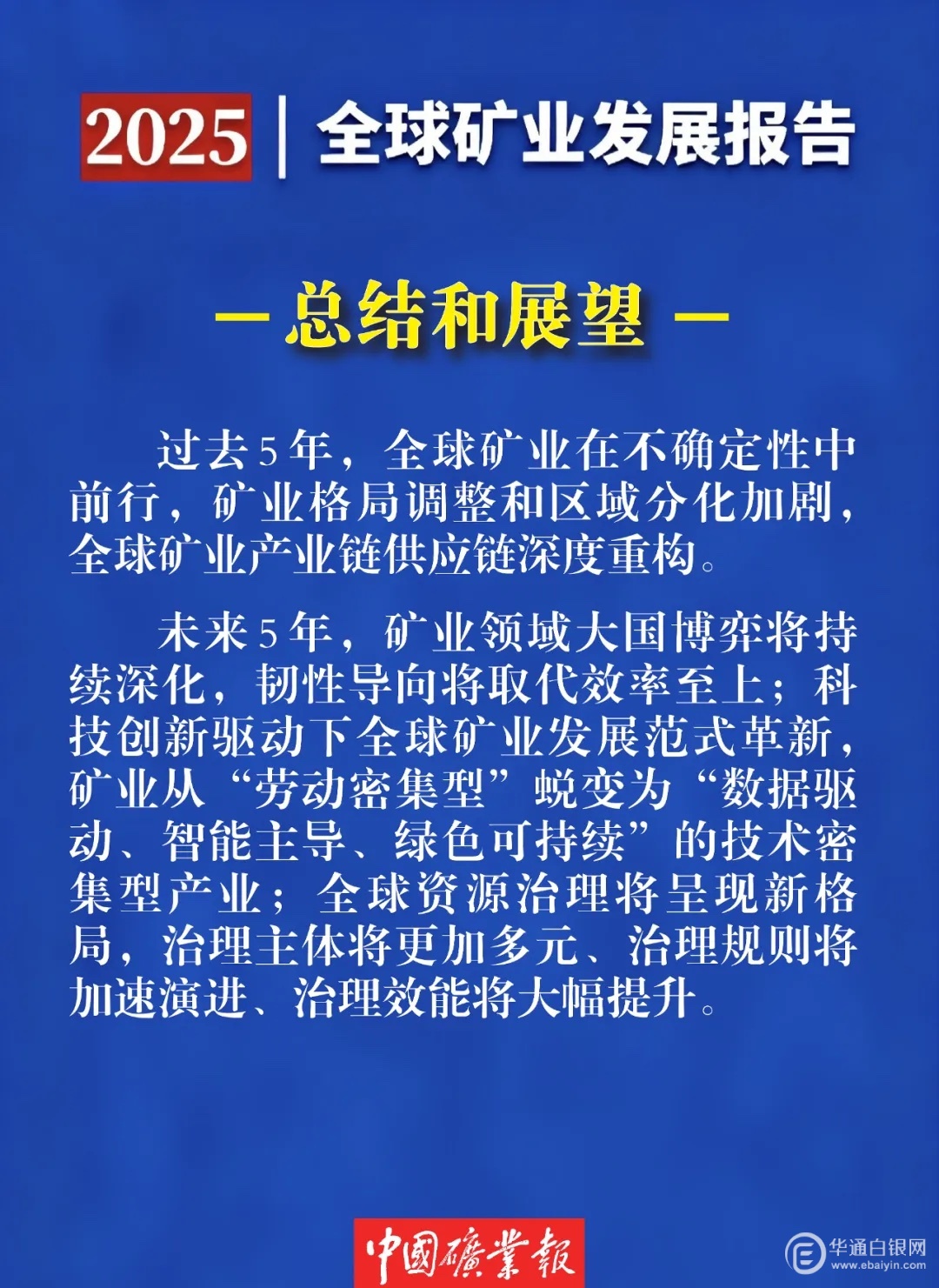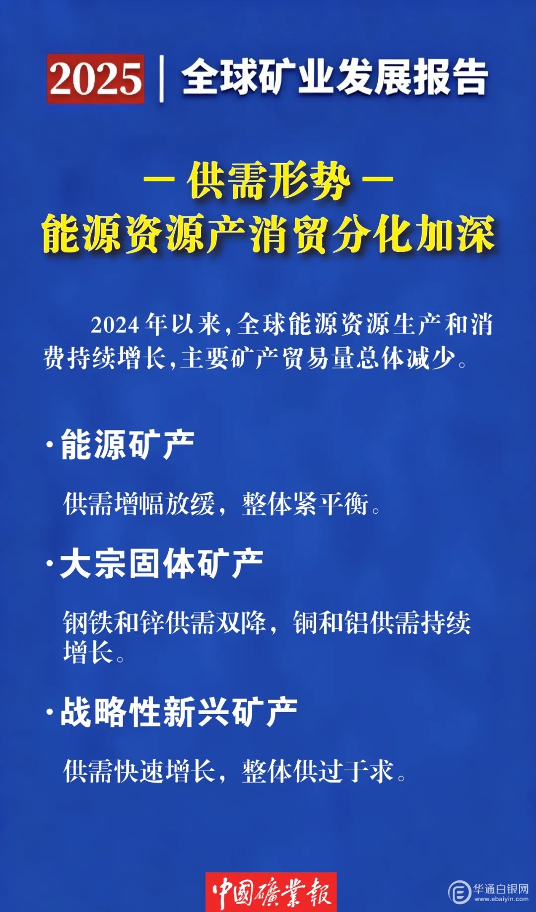 10月24日,自然资源部中国地质调查局国际矿业研究中心发布了《全球矿业发展报告2025》(以下简称《报告》)。 《报告》显示,在世界经济“低常态”增长背景下,全球矿业产业链供应链重构加深,供需结构性矛盾不断加剧,而科技创新、全球治理和绿色可持续又为矿业高质量发展注入新动能。全球矿业向绿色化、智能化、全产业链整合等趋势加速转型发展。 供需方面,《报告》显示,全球能源资源生产和消费持续增长,供需结构矛盾加剧。其中,能源矿产供需增幅放缓,整体处于紧平衡。大宗固体矿产中,铜供需持续增长,供应缺口扩大;铝供需双升,供应过剩程度减小;锌供需双降,转向供不应求。战略性新兴矿产供需快速增长,均表现为供过于求。贵金属矿产中,黄金供需双升,但供过于求;白银供降需增,供应缺口维持高位;铂金供需双升,供不应求格局加深。 市场价格方面,《报告》显示,国际矿产品价格分歧显著,矿业公司股价和利润总体下行,矿业融资和并购交易市场双双降温。2024年全球主要固体矿产融资额同比下降11.7%,主要固体矿产并购交易额和项目数同比分别下降42.6%、31.8%。《报告》指出,关键矿产已成为各国国家安全和资源战略的重要组成部分,资源博弈加剧全球关键矿产领域竞合态势。发达国家通过更新关键矿产清单、设置贸易壁垒、强化资源联盟、主导合规标准等持续推动供应链区域化和产业本土化回流;资源民族主义抬头、出口管制升级和矿业政策分歧等进一步割裂全球市场。资源型国家通过推动矿业法律审查和修订、深化矿政管理制度改革、加强ESG实践重视程度等手段持续完善本国矿产资源治理框架。伴随全球能源转型和新一轮科技革命的纵深推进,面向勘查大数据的AI技术、地球物理技术装备和天-空-地立体遥感找矿技术体系等逐步完善,加速推动全球矿业向数字化、智能化、绿色化转型升级。 《报告》预计,随着新能源等矿产需求持续扩大,矿业领域大国博弈将进一步深化,韧性导向将取代效率至上。科技创新驱动下全球矿业发展范式革新,推动全球矿业从“劳动密集型”蜕变为“数据驱动、智能主导、绿色可持续”的技术密集型产业。百年变局将重塑全球资源治理合作格局,治理主体将更加多元,治理规则将加速演进,治理效能将大幅提升。《报告》呼吁,各国应加强关键矿产领域互利合作,共同维护产业链供应链稳定畅通,携手构建矿业命运共同体,破解全球资源困境,实现可持续发展,为世界经济增长贡献力量。
