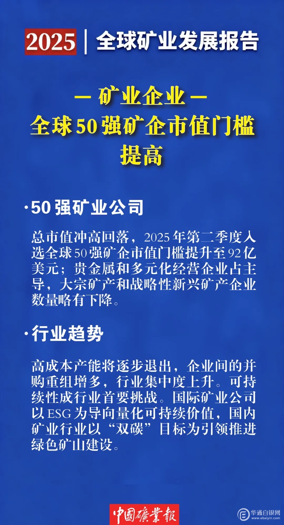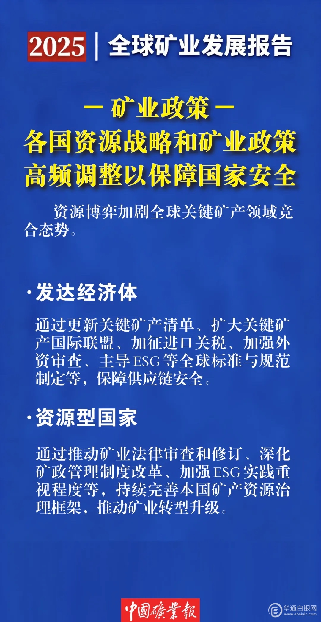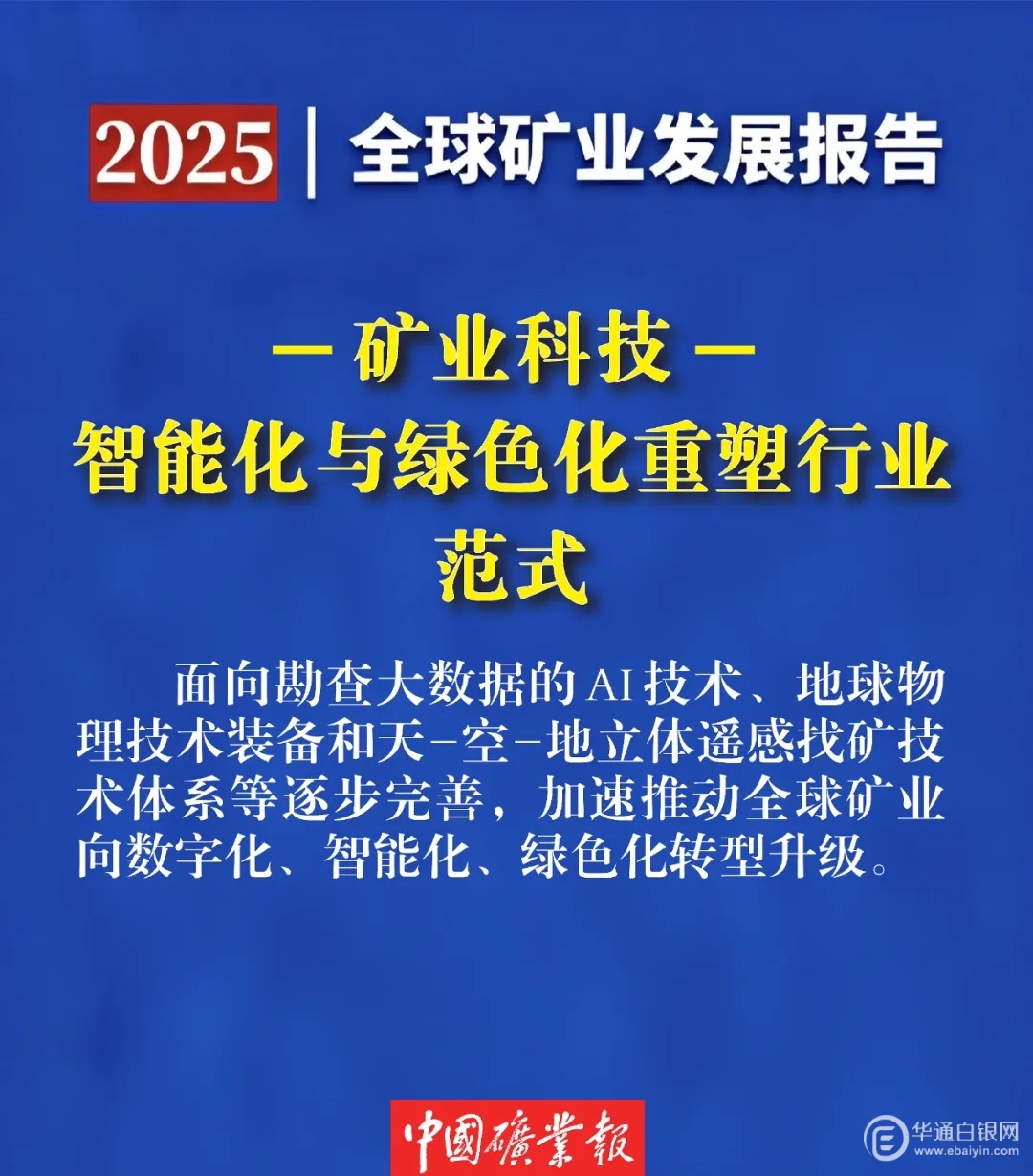10月24日,自然资源部中国地质调查局国际矿业研究中心发布了《全球矿业发展报告2025》(以下简称《报告》)。 《报告》显示,在世界经济“低常态”增长背景下,全球矿业产业链供应链重构加深,供需结构性矛盾不断加剧,而科技创新、全球治理和绿色可持续又为矿业高质量发展注入新动能。全球矿业向绿色化、智能化、全产业链整合等趋势加速转型发展。 供需方面,《报告》显示,全球能源资源生产和消费持续增长,供需结构矛盾加剧。其中,能源矿产供需增幅放缓,整体处于紧平衡。大宗固体矿产中,铜供需持续增长,供应缺口扩大;铝供需双升,供应过剩程度减小;锌供需双降,转向供不应求。战略性新兴矿产供需快速增长,均表现为供过于求。贵金属矿产中,黄金供需双升,但供过于求;白银供降需增,供应缺口维持高位;铂金供需双升,供不应求格局加深。 市场价格方面,《报告》显示,国际矿产品价格分歧显著,矿业公司股价和利润总体下行,矿业融资和并购交易市场双双降温。2024年全球主要固体矿产融资额同比下降11.7%,主要固体矿产并购交易额和项目数同比分别下降42.6%、31.8%。《报告》指出,关键矿产已成为各国国家安全和资源战略的重要组成部分,资源博弈加剧全球关键矿产领域竞合态势。发达国家通过更新关键矿产清单、设置贸易壁垒、强化资源联盟、主导合规标准等持续推动供应链区域化和产业本土化回流;资源民族主义抬头、出口管制升级和矿业政策分歧等进一步割裂全球市场。资源型国家通过推动矿业法律审查和修订、深化矿政管理制度改革、加强ESG实践重视程度等手段持续完善本国矿产资源治理框架。伴随全球能源转型和新一轮科技革命的纵深推进,面向勘查大数据的AI技术、地球物理技术装备和天-空-地立体遥感找矿技术体系等逐步完善,加速推动全球矿业向数字化、智能化、绿色化转型升级。 《报告》预计,随着新能源等矿产需求持续扩大,矿业领域大国博弈将进一步深化,韧性导向将取代效率至上。科技创新驱动下全球矿业发展范式革新,推动全球矿业从“劳动密集型”蜕变为“数据驱动、智能主导、绿色可持续”的技术密集型产业。百年变局将重塑全球资源治理合作格局,治理主体将更加多元,治理规则将加速演进,治理效能将大幅提升。《报告》呼吁,各国应加强关键矿产领域互利合作,共同维护产业链供应链稳定畅通,携手构建矿业命运共同体,破解全球资源困境,实现可持续发展,为世界经济增长贡献力量。
