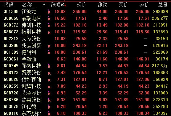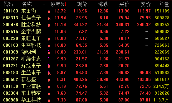 消息面上,我国光刻胶领域取得新突破。近日,北京大学化学与分子工程学院彭海琳教授团队及合作者通过冷冻电子断层扫描技术,首次在原位状态下解析了光刻胶分子在液相环境中的微观三维结构、界面分布与缠结行为,指导开发出可显著减少光刻缺陷的产业化方案。相关论文近日刊发于《自然·通讯》。 银河证券指出,该方案首次在原位状态下解析了光刻胶分子在液相环境中的微观三维结构、界面分布与缠结行为,当前光刻技术是推动集成电路芯片制程工艺持续微缩的核心驱动力之一。据锐观产业研究院报告,2024年我国光刻胶市场规模增长至114亿元以上,预计2025年光刻胶市场规模可达123亿元。光刻胶作为半导体、印制电路板、平板显示等行业的基础材料,其技术进步可以促进相关产业链的协同发展,上游材料供应商、设备制造商,中游光刻胶生产企业,以及下游光刻胶产品应用企业都能从中受益。 另外,AI繁荣背景下,存储芯片的“超级周期”持续演绎。据报道,三星电子、SK海力士等内存供应商,将在四季度继续向客户调整报价,包括DRAM和NAND在内存储产品价格将上调30%。 机构表示,当前AI服务器、数据中心等对存储芯片需求呈指数级增长,这种旺盛的市场需求打破了存储行业传统的供需平衡,存储芯片涨价逻辑或将延续。与此同时,存储芯片涨价也直接提升了相关企业的短期盈利预期,特别是那些在AI大模型浪潮中受益的DRAM和HBM芯片制造商,以及上游半导体设备和材料的供应商。 AI产业链股活跃 CPO概念等AI产业链股盘中走势强劲,截至收盘,东田微涨近13%,盘中一度涨停;仕佳光子涨约12%,景旺电子、生益科技、德明利等均涨停;新易盛涨逾8%突破400元大关,中际旭创涨约3%突破500元大关,盘中均创出新高。