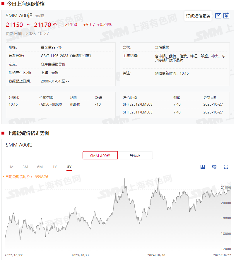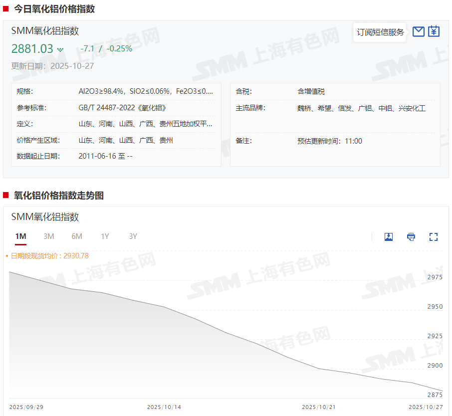 》点击查看SMM铝产品现货报价 具体来看,据SMM了解,7-8月,海内外宏观氛围偏多,美联储降息预期强劲,国内同样出台一些利好政策,但传统淡季之下,下游企业开工下降,需求减弱,铝价整体震荡整理为主。9月份国内电解铝价格运行重心稍显上移,主要在20600-21000元/吨之间震荡运行,自然月均价录得20766元/吨,虽然9月已进入传统旺季,从下游开工表现来看,需求并未出现边际大幅改善,下游仍以刚需采购和逢低补库为主。 进入10月,基本面上,铝水比例进一步提高,铝加工综合PMI仍在荣枯线上方,需求预计进一步回暖,电解铝供需预计呈现紧平衡;宏观面上,据SMM上周了解,国内方面,宏观情绪向好,支撑市场信心。国家统计局在20日发布的数据显示,初步核算,前三季度,我国GDP为1015036亿元,按不变价格计算,同比增长5.2%;三季度,我国GDP为354500亿元,按不变价格计算,同比增长4.8%。海外消息扰动频繁,情绪反复,不确定性较强:一方面,美联储内部关于降息路径存在较大分歧,美联储新任理事米兰支持在10月议息会议上降息50个基点,美联储理事沃勒主张维持每次25个基点的谨慎降息步伐以应对疲软的劳动力市场,美联储穆萨莱姆则表示,如果就业面临更多风险,且通胀得到控制,可能支持再次降息的路径,最新公布的美国 9 月通胀数据全线低于预期,美联储降息前景增强;中美结束贸易谈判,就稳妥解决多项重要经贸议题形成初步共识,美国财长贝森特在接受美媒采访时表示美方不再考虑对中国加征100%的关税,关注APEC领导人峰会相关信息;此外,俄乌冲突方面,周初消息称特朗普与普京计划在布达佩斯举行会晤,引发了结束俄乌冲突的希望,本周后段,特朗普称取消与普京在布达佩斯的会面,因为会面不会取得任何进展,另外欧盟批准了第19轮对俄的制裁措施,其中包括液化天然气进口禁令;贝森特称将“大幅加码”对俄制裁,随后美国财政部宣布制裁两大俄油公司。 综合来看,宏观层面,海外风险较大,但暂未出现明显利空消息;国内宏观情绪向好。基本面上,海外供应预期收紧,国内供应平稳,整体电解铝供需预计趋紧,叠加国内铝锭库存持续去化,支撑近期铝价偏强震荡。传统旺季之下,SMM预计10月份铝价重心预计进一步小幅上行。 此外,氧化铝等原材料价格的下跌,也在一定程度上降低了不少以氧化铝作为原料的铝企业的成本。据SMM历史价格显示,自进入2025年以来,SMM氧化铝指数一路下跌,从年初的5675元/吨,跌至9月底的2975.13元/吨,跌幅达47.57%。