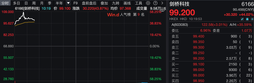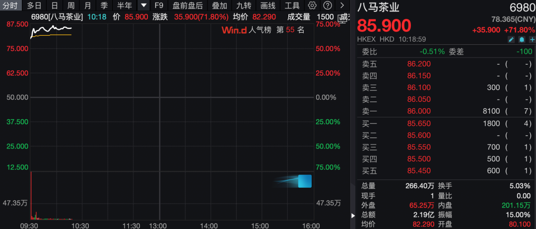 据八马茶业公布的配发结果,公司全球发售了900万股H股,其中香港公开发售占10%,国际发售占90%。每股的发售价定为50港元,此次全球发售净筹集约3.9亿港元。在认购方面,香港公开发售获得了2680.04倍的认购,而国际发售则获得了13.58倍的认购。 另外一只新股剑桥科技,早盘一度涨超50%,截至发稿,最新涨幅为44%。剑桥科技主要从事设计、开发及销售连接及数据传输设备。