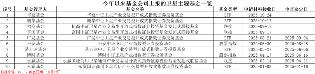 近期,华夏基金、鹏华基金两家公募上报卫星产业相关ETF产品,易方达基金旗下产品则进入发售期。 随着我国商业航天产业快速崛起,卫星产业链作为核心环节迎来投资热潮,公募基金纷纷加速布局相关主题产品,年内已有10只产品申报。 业内分析,这一趋势背后是对产业广阔增长前景的看好。据预测,2025年我国商业航天产业规模将达2.5万亿元,低轨卫星的规模化部署有望全面拉动全产业链增长,催生丰富投资机遇。 主题基金迎来申报热潮 2025年以来,卫星主题基金申报呈现突破式增长态势。Wind数据显示,年初至今已有9家基金公司合计上报10只卫星主题指数基金,包括5只ETF、3只ETF联接基金及2只股票型指数基金。这与2022—2024年三年间无一只同类产品申报的“冷清”局面形成鲜明对比。 进入四季度,布局节奏进一步加快:10月17日鹏华中证卫星产业ETF、10月24日华夏中证卫星产业ETF相继提交申报材料;10月27日,易方达中证卫星产业ETF正式启动认购,博时中证卫星产业指数基金也在同步募集中。 此前,市场上仅有两只卫星主题基金(富国、招商旗下中证卫星产业ETF),均于2021年6月上报,直至2025年2月才获批。 今年上报的产品中,除永赢基金布局的是跟踪国证商用卫星通信产业指数的ETF及联接基金外,其余公司布局的产品均挂钩中证卫星产业指数。 从指数成份股来看,中证卫星产业指数作为基准指数,在卫星产业链内部的行业分布较为均衡,涵盖了卫星制造、发射服务、地面设备制造及卫星运营服务等全产业链上市公司,旨在反映卫星应用产业的整体走势。相比之下,国证商用卫星通信产业指数更侧重通信板块。 截至10月27日,两大指数今年以来分别上涨27.83%和24.06%,显著的赚钱效应进一步带动资金关注。 目前,今年上报的10只卫星主题基金中已有6只获批,其中4只完成发行成立,且规模增长表现亮眼。年初成立的永赢国证商用卫星通ETF规模从成立时的2.39亿元增至12.89亿元;5月成立的招商中证卫星产业ETF规模也从2.06亿元增长至5.37亿元。此外,10月中旬成立的广发中证卫星产业ETF首发规模接近12亿元,体现出投资者对卫星产业的高度认可。 此外,仍有4只基金处于排队获批状态,包括四季度新上报的两只ETF及招商、富国旗下的中证卫星产业ETF联接基金,后续公募布局力度或将持续加大。