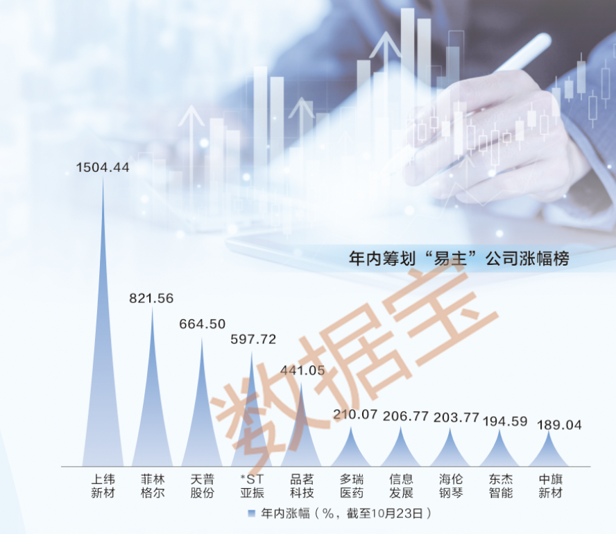 筹划控制权易主数量创纪录。 今年以来,A股市场上市公司筹划控制权易主案例数量大幅增加,引发市场高度关注。部分控制权易主公司股价连续涨停,其中上纬新材年内涨幅更是超过15倍,天普股份等亦连续一字涨停,成为市场焦点。 在政策护航与市场需求的双重驱动下,年内上市公司控制权交易案例数量已突破100家并创出年度历史新高。本文将从公司特征、交易方式及目的等维度,拆解当前控制权交易的现状,同时揭示背后的机会与风险。 数量创纪录 政策支持为控制权交易创造了条件。早在2024年9月底,监管层便已密集推出一系列政策举措,旨在鼓励上市公司通过资源优化配置来提升经营效率。 迈入2025年,A股市场便迅速迎来一波控制权变更的汹涌浪潮。据证券时报·数据宝统计,截至10月23日,通过筛选“筹划控制权变更”“控制权拟发生变更”等关键词的公告,发现112家上市公司有控制权易主事项,数量创下历年新高。回顾以往,2017年以前控制权易主的公司数量较少,2020年后开始大幅增长,2020年至2024年期间,数量均在60家以上,其中2020年达到100家。 基于对资产运作的预期,上市公司控制权交易,往往伴随着股价大涨。据数据宝统计,截至10月23日,年内有筹划控制权交易的上市公司中,有22家年内股价已翻番。A股年内股价涨幅前十的公司中,有5家涉及控制权交易,包括上纬新材、菲林格尔、*ST亚振、天普股份、品茗科技。