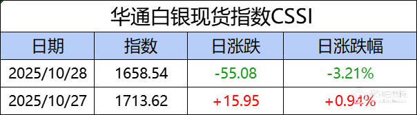 华通白银现货指数CSSI走势日报,今日指数1658.54,日涨跌-55.08,日涨跌幅-3.21%