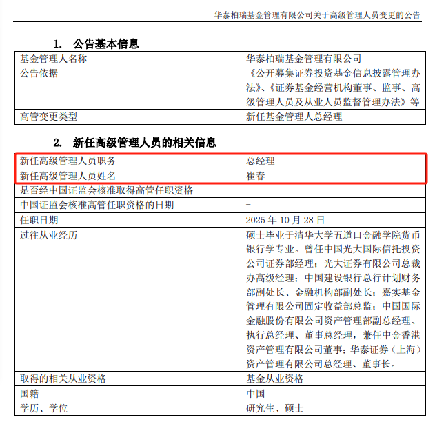 又一家大型基金公司迎来新总经理。 10月28日,华泰柏瑞基金发布公告,前华泰证券资管董事长崔春自10月28日起担任公司总经理,董事长贾波不再代行总经理职责。 公开资料显示,华泰柏瑞基金成立于2004年11月18日,华泰证券、柏瑞投资并列第一大股东。截至今年三季度末,旗下公募基金管理规模超8000亿元,其中,非货基金规模超7200亿元。 华泰柏瑞基金在ETF领域积累了长期的竞争优势,崔春具有证券、基金、银行等多领域实战经验。此次人事任命被外界视为华泰柏瑞基金在强化传统优势基础上,进一步拓展多元业务、提升综合竞争力、深化战略协同的重要布局。 华泰柏瑞基金,官宣新任总经理 在上周辞任华泰证券资管董事长之后,资管行业资深干将——崔春下一站最终落定。 10月28日,华泰柏瑞基金发布公告,前华泰证券资管董事长崔春担任公司总经理,董事长贾波不再代行总经理职责。