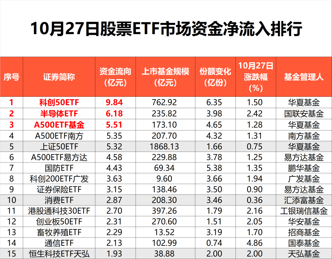 10月27日,A股上涨,沪指逼近4000点关口,继续刷新年内新高;创业板指涨近2%。存储芯片板块集体爆发,可控核聚变概念股反复活跃,风电板块调整。 在股市大涨背景下,资金借道股票ETF出现部分净流出。昨日,股票ETF市场净流出资金近26亿元,银行ETF、芯片ETF等行业主题ETF,以及SGE黄金9999指数净流出居前;而债券ETF、港股市场ETF净流入居前。 昨日净流出资金近26亿元 Wind数据显示,截至10月27日,全市场1233只股票ETF(含跨境ETF)总规模达4.67万亿元。 在昨日股市大涨行情中,股票ETF市场总份额减少11.79亿份,按照区间成交均价测算,净流出资金达25.94亿元。 从大类型来看,昨日债券ETF与港股市场ETF净流入居前,分别为24.52亿元与4.6亿元。受益于大盘普涨,宽基ETF昨日规模增长323.98亿元。 具体到指数维度,昨日AAA科创债指数净流入居前,达18.65亿元。 从5日角度观测,近期资金流入SGE黄金9999指数超58亿元,流入恒生科技指数超24亿元。 其中,华夏基金旗下科创50ETF净流入近10亿元,位居全市场首位。半导体ETF、A500ETF基金也有超5亿元的净流入。