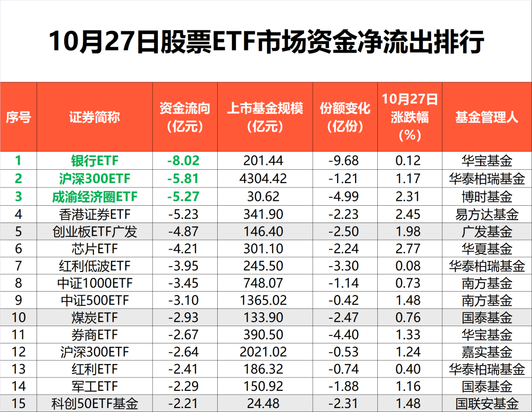 市场大涨背景下,头部基金公司旗下ETF持续获得资金净流入。 易方达基金旗下ETF方面,昨日易方达基金旗下非货ETF规模达8353亿元,单日增长101亿元。其中,A500ETF易方达最新规模为229.88亿元,昨日净流入4.58亿元;证券保险ETF净流入3.15亿元。另外,机器人ETF易方达、恒生科技ETF易方达昨日净流入也均超1亿元。 华夏基金旗下ETF方面,昨日科创50ETF和A500ETF基金净流入居前,分别净流入9.84亿元和5.51亿元,最新规模分别达762.92亿元和173.1亿元,对应跟踪指数近一月日均成交额分别为58.76亿元和49.61亿元。另外,上证50ETF净流入5.32亿元,沪深300ETF华夏和游戏ETF净流入均超1亿元。 银行ETF、芯片ETF净流出居前 资金流出方面,行业主题ETF净流出居前,达27.31亿元;SGE黄金9999指数单日净流出居前,达15.75亿元。 具体来看,银行ETF昨日净流出超8亿元,位居全市场首位。另外,成渝经济圈ETF、香港证券ETF等净流出也超5亿元。 宽基ETF方面,沪深300ETF、创业板ETF广发、中证1000ETF等多只产品净流出超3亿元,位居市场靠前位置。