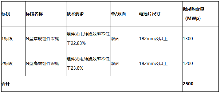 光伏逆变器集采: 本项目不划分标段,采购300-400kW组串式逆变器及其附属设备,预估采购总容量为3GW。 固定支架集采: 本招标项目不划分标段,采购固定不可调光伏支架(不含固定可调及跟踪支架、柔性支架),预估采购总容量2.5GW,重量约10万吨。 开标时间均为2025年11月18日。 具体来看: 三峡集团2026年光伏组件框架集中采购(第一批次)招标公告 项目所在地区:三峡集团所属各光伏电站 一、招标条件 本三峡集团2026年光伏组件框架集中采购(第一批次)项目已获批准,项目资金来源为中国长江三峡集团有限公司下属各项目公司自有及自筹资金,招标人为三峡物资招标管理有限公司,招标代理机构为 三峡国际招标有限责任公司。本项目已具备招标条件,现招标方式为公开招标。 二、项目概况和招标范围 2.1项目概况 本项目为三峡集团2026年度光伏组件框架集中采购(第一批次),预估采购总容量2500MWp。本次招标为框架采购,框架协议计划分配期限为合同签订之日起至2026年6月30日;如在分配期限内,实际采购容量未达到中标人预估授标容量,招标人有权顺延2次,每次不超过3个月;如在分配期限内,实际采购容量达到中标人预估授标容量,招标人有权提前终止分配。 2.2 标段划分 本项目共设2个标段,其中: 1标段:N型常规组件采购; 2标段:N型高效组件采购。 2.3 招标范围 (1)本项目预估采购总容量约2500MWp。各标段情况如下表: