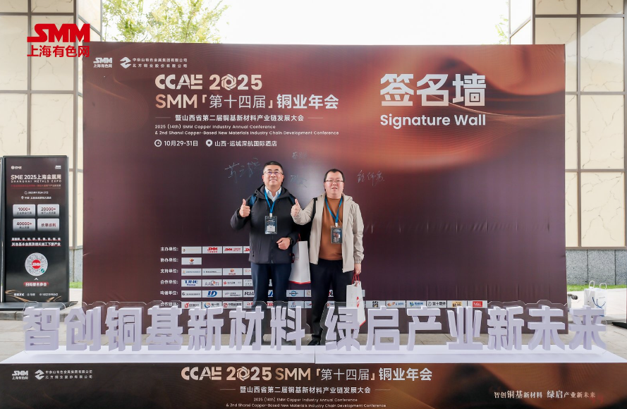 1V1 2026长单供需洽谈区 (13:30-17:00) 论坛一:金属矿冶智造与应用发展论坛 嘉宾发言 发言主题:深度剖析中条山集团铜尾矿综合利用典型案例与行业启示 发言嘉宾:山西舜王建筑工程有限公司董事长 于 刚 (13:30-14:00) 发言主题:中国铜矿资源战略与海外投资风险应对 发言嘉宾:中国地质大学教授 朱 清 (14:00-14:30) 发言主题:宏观视角铜市场未来展望 发言嘉宾:上海东证期货有限公司首席分析师 曹 洋 (14:30-15:00) 发言主题:AI 新能源产业中的铜材应用 发言嘉宾:浙江花园新能源股份有限公司董事长 潘建锋 (15:00-15:30) 圆桌访谈:再生阳极铜在铜冶炼原料结构优化中的关键作用 主持人:SMM铜高级分析师 姜善誉 访谈嘉宾:北方铜业股份有限公司副总经理 吕 勇 山东鑫泽铜业有限公司副总经理 周晓敏 中南大学博士生导师 雷 前 新煌集团副总裁 梁逸龙 (15:30-16:30) 发言主题:技·数驱动,贸·融结合,助力有色产业新生态 发言嘉宾:上海有色网金属交易中心有限公司董事长兼总经理 董 谌 (16:30-17:00) SMM&为恒智能:铜产业储能合作专场沙龙 (13:30-17:00) 10月30日 开幕式及致辞 山西省工业和信息化厅 领导 山西省运城市人民政府市长 姚逊 中条山有色金属集团有限公司董事长 魏迎辉 上海有色网金属交易中心有限公司董事长兼总经理 董谌 (08:15-08:40) 主论坛:2025SMM(第十四届)铜业年会 嘉宾发言 发言主题:中国铜工业“十五五”高质量发展战略思考 发言嘉宾:中国有色金属工业协会原会长 康 义 (08:40-09:15) 发言主题:铜矿产业现状与绿色转型路径 发言嘉宾:中条山有色金属集团有限公司董事长 魏迎辉 (09:15-09:40) 发言主题:零碳园区解决方案助力铜行业绿色低碳发展 发言嘉宾:阳光新能源开发股份有限公司大客户总经理 田 原 (09:50-10:10) 圆桌访谈:铜产业破局:资源、技术与市场的三重挑战 主持人:SMM大数据总监 叶建华 访谈嘉宾:北方铜业股份有限公司总经理 姜卫东 中铝洛阳铜加工有限公司总经理助理 诸 捷 上海靖升金属材料有限公司副总经理 李 烨 重庆渝铜有色金属有限公司董事长 胡孟康 (10:10-11:10) 发言主题:2025全球铜产业链供需格局与价格预测 发言嘉宾:SMM大数据总监 叶建华 (11:10-11:40) 山西省铜基新材料产业链招商推介会 推介主题:山西省铜基新材料等重点产业链培育情况、政策介绍 推介嘉宾:山西省工业和信息化厅 (15:00-15:10) 推介主题:山西省招商引资政策介绍 推介嘉宾:山西省投资促进局 (15:10-15:20) 推介主题:运城市经济开发区产业发展推介 推介嘉宾:运城经济技术开发区管委会 (15:20-15:30) 推介主题:垣曲县经济开发区产业发展推介 推介嘉宾:垣曲经济技术开发区管委会 (15:30-15:40) 推介主题:山西北铜新材料公司产品推介 推介嘉宾:山西北铜新材料科技有限公司 (15:40-15:50) 引资项目和供应链签约 (15:50-16:00) 互动交流 (16:00-16:30) “中条之夜 ”招待晚宴 (18:00-20:30) 10月30日还有铜基新材料重点应用论坛、铜产业低碳能源转型论坛的直播内容,敬请移步查看~ 》点击查看CCAE 2025 SMM(第十四届)铜业年会暨山西省第二届铜基新材料产业链发展大会专题报道 |