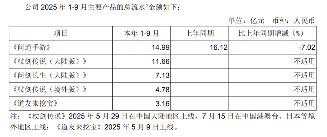 爆款游戏是亮眼业绩的主要支撑。吉比特表示,《杖剑传说(大陆版)》《道友来挖宝》于2025 年5月上线,第三季度运营了完整周期,营业收入及利润环比均大幅增加,另外《杖剑传说(境外版)》于2025 年7 月上线,贡献增量营业收入及利润。前三季度公司的境外营业收入合计达到5.9亿元,同比增长近59.5%。 吉比特在2023年、2024年时一度面临增长困境,因老游戏流水下滑,新游戏未能接档,连续两年营收、利润双降。吉比特在2024年营收近37亿元,同比减少11.7%;归母净利润同比减少16%至9.5亿元,此前的主力产品流水持续下降。 吉比特在此次公告中披露了具体产品的流水情况,《问道》端游、《问道手游》《一念逍遥(大陆版)》是早期支柱游戏,收入和利润均在减少,前三季度《问道手游》贡献流水近15亿元,同比下降7%。