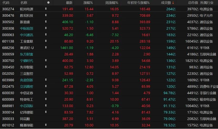 指数大涨,但个股分化明显,市场呈现出“局部热”的特征。截至收盘,共计2672只个股收涨,其中涨停股66只;2621只个股收跌,跌停股10只。 日成交额靠前的个股基本以科技股为主,且今日多数上涨。其中,阳光电源表现尤为突出,今日成交额高达264亿元,股价涨幅超过15%;胜宏科技涨近4%,工业富联涨幅超过9%。