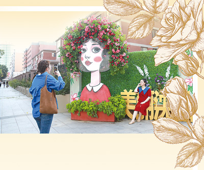 沈阳市民在位于青年大街上的玫瑰少女景观小品前拍照。 记者胡婧怡摄