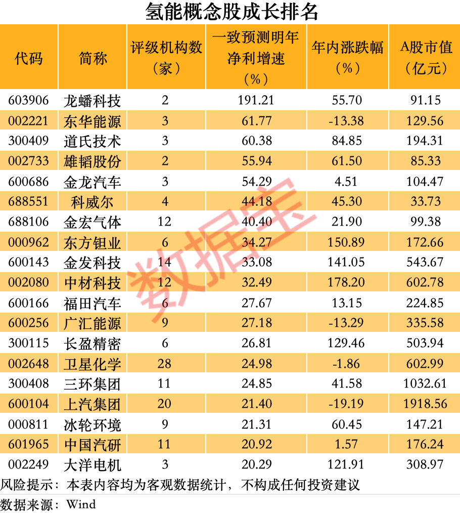 资料显示,鹏辉能源是中国较大的电池生产厂家之一,主营绿色高性能电池的研发、生产及销售。 东吴证券指出,国内强制配储取消后,独立储能爆发,全年维持30%至40%增长;美国OBBB执行前项目抢装,预计增长40%;欧洲与新兴市场爆发,维持1—2倍增长,预计全年储能电池需求550gwh,同比增长70%,同时2026年欧洲与新兴市场持续性可期,预计全球储能需求增长40%至770gwh。欧洲动力2025年预计增长超30%,2026年叠加新车型+政策催化,预计维持30%增长。总体锂电需求2025年上修至40%增长,2026年预计增长超25%,供需格局大幅好转。 氢能站上风口 新能源产业长期前景看好。10月28日发布的《中共中央关于制定国民经济和社会发展第十五个五年规划的建议》明确提出,“加快建设新型能源体系”,同时提到推动氢能和核聚变能成为新的经济增长点。 核聚变题材已经引爆,氢能概念能否跟上值得关注。光大证券表示,近期我国氢能产业政策频出,从考核可再生能源非电消费、到中央专项资金支持绿色甲醇项目、再到本次将氢能纳入未来产业规划,均体现出我国正持续加大对氢能领域的政策支持。氢能行业的发展离不开持续性降本(无论是早期的技术进步和规模化降本,还是后期材料工艺优化带来的持续降本),也离不开产业和国家层面的补贴/激励等政策对下游各类使用场景应用的支持,在国内政策密集催化和全球航运业及其他高碳排产业加快脱碳转型的背景下,我国绿色氢氨醇产业有望迎来新的发展契机和更为广阔的发展空间。 潜力股揭秘 A股市场上氢能概念股合计有近60只。从机构关注度来看,宝丰能源、卫星化学、上汽集团等个股均有20家以上机构评级,潍柴动力、宇通客车、隆基绿能、金发科技等个股均有10家以上机构评级。 部分公司主营提及了氢能业务。比如科威尔目前主要产品线有测试电源、氢能测试及智能制造装备、功率半导体测试及智能制造装备等。美锦能源作为国内氢能产业链布局最完整的龙头企业之一,公司依托焦化主业副产氢的资源优势,通过前瞻性战略卡位与生态化布局,构建起“低成本氢源+场景深耕+区域协同+技术壁垒”四位一体的氢能核心竞争力体系,实现从传统焦化巨头向氢能生态领军者的跨越式转型。 从成长性来看,根据机构一致预测,两家机构以上评级个股中,有19只概念股明年净利增速超20%。其中,龙蟠科技增速位居第一,超过191%,东华能源、道氏技术、雄韬股份等个股增速均超50%。