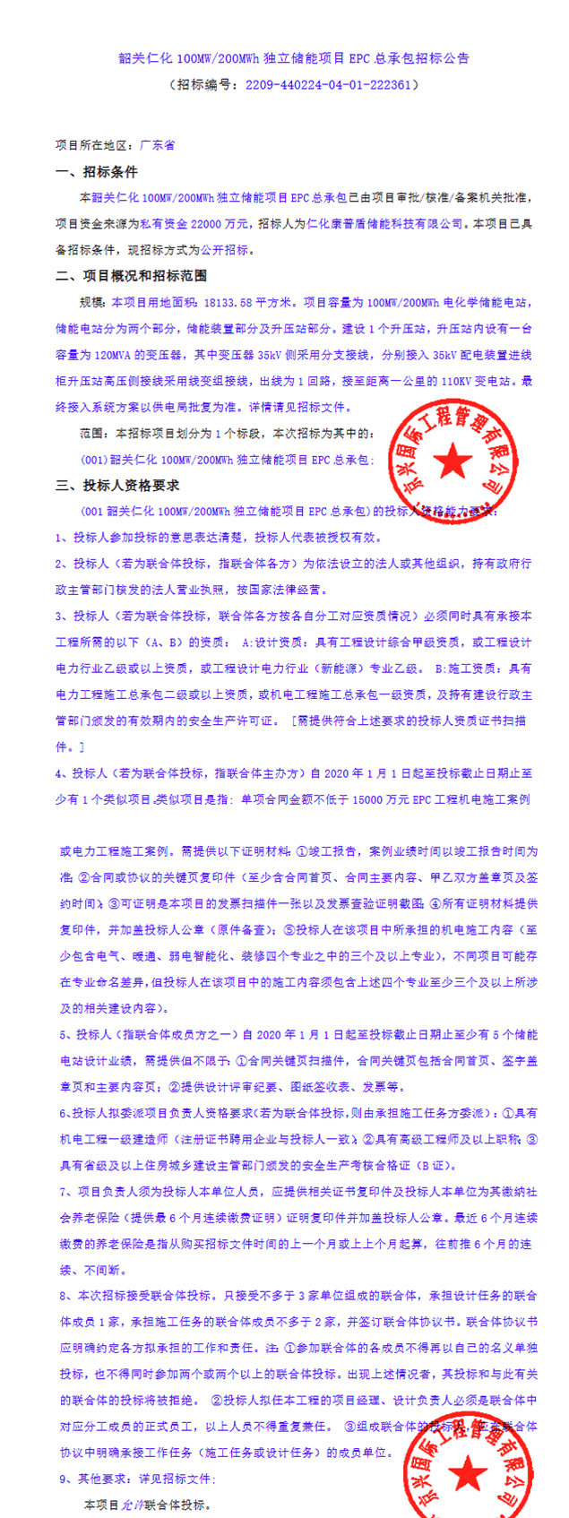 10月29日,仁化康普盾储能科技有限公司发布韶关仁化100MW/200MWh独立储能项目EPC总承包招标公告。项目位于广东韶关,项目建设100MW/200Mh 电化学储能电站。项目资金来源为私有资金 22000万元,折合单价1.1元/Wh。