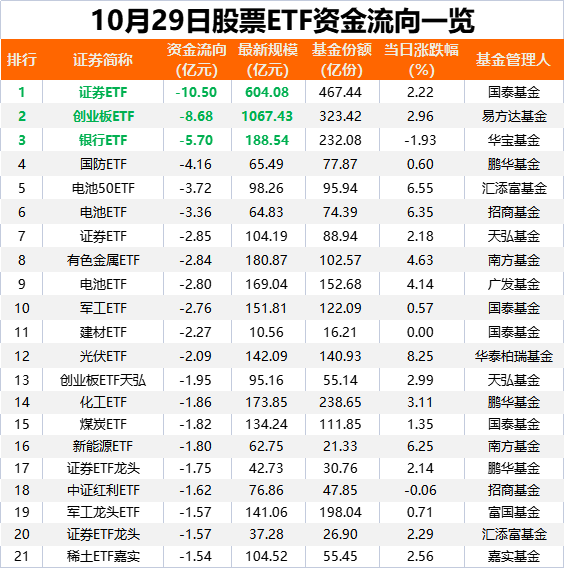 10月29日股票ETF市场净流出资金约8亿元,红利板块净流出居前